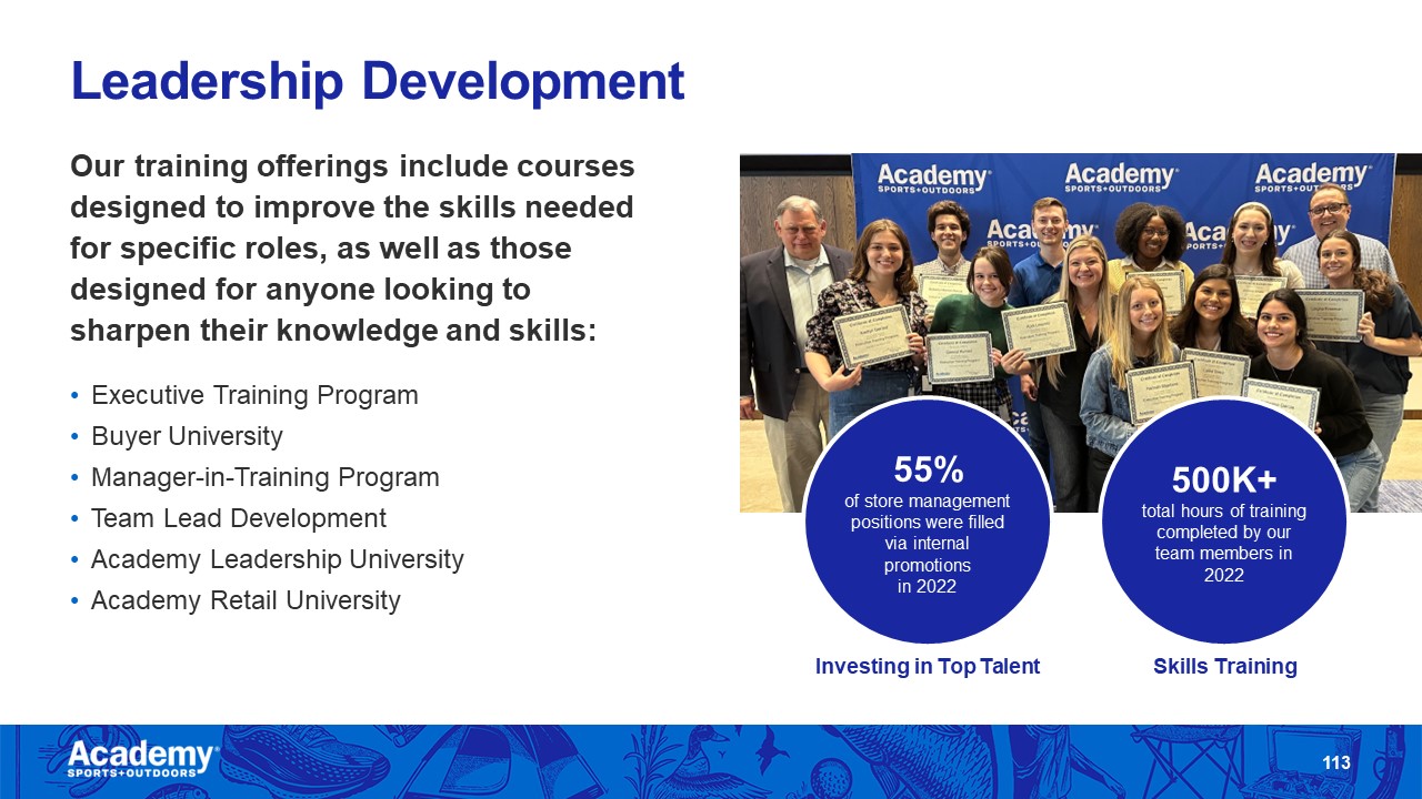 Leadership Development  Our training offerings include courses designed to improve the skills needed for specific roles, as well as those designed for anyone looking to sharpen their knowledge and skills:  Executive Training Program  Buyer University  Manager-in-Training Program  Team Lead Development  Academy Leadership University  Academy Retail University  113  Skills Training  55% of store management positions were filled via internal promotions in 2022  Investing in Top Talent  500K+total hours of training completed by our team members in 2022