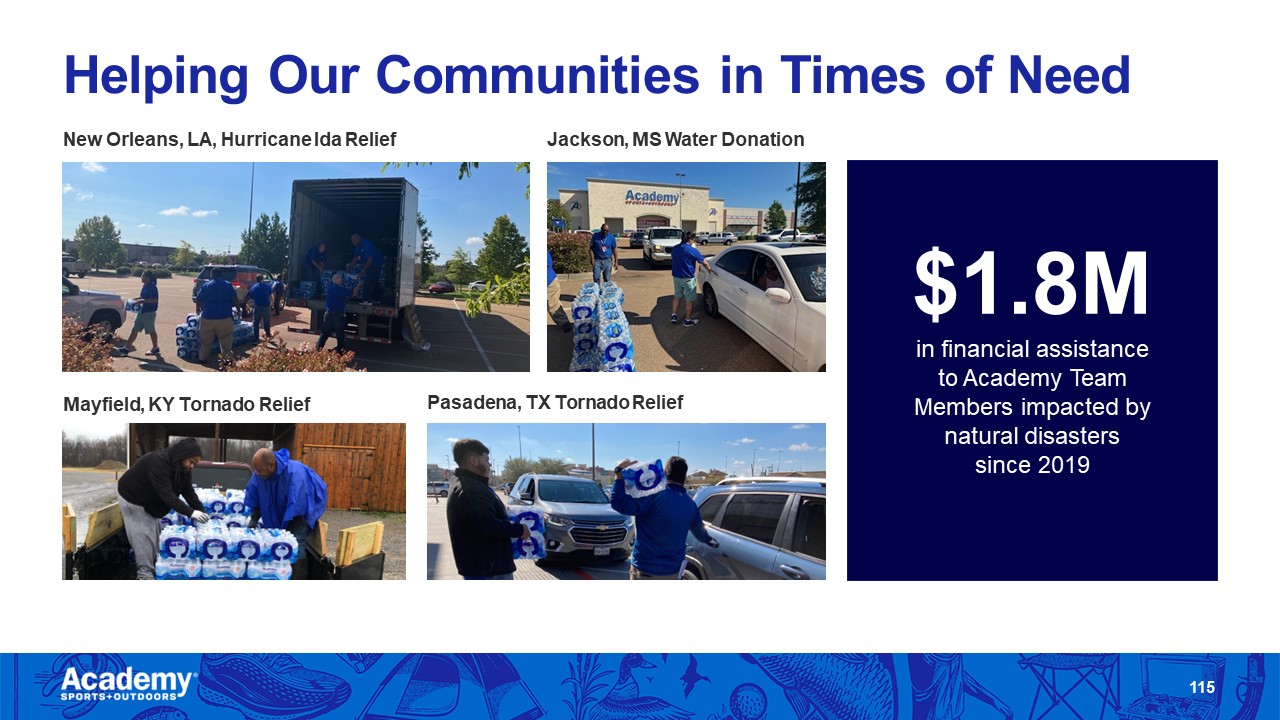Helping Our Communities in Times of Need  New Orleans, LA, Hurricane Ida Relief  115  Jackson, MS Water Donation  Mayfield, KY Tornado Relief  Pasadena, TX Tornado Relief  $1.8M in financial assistance to Academy Team Members impacted by natural disasters since 2019