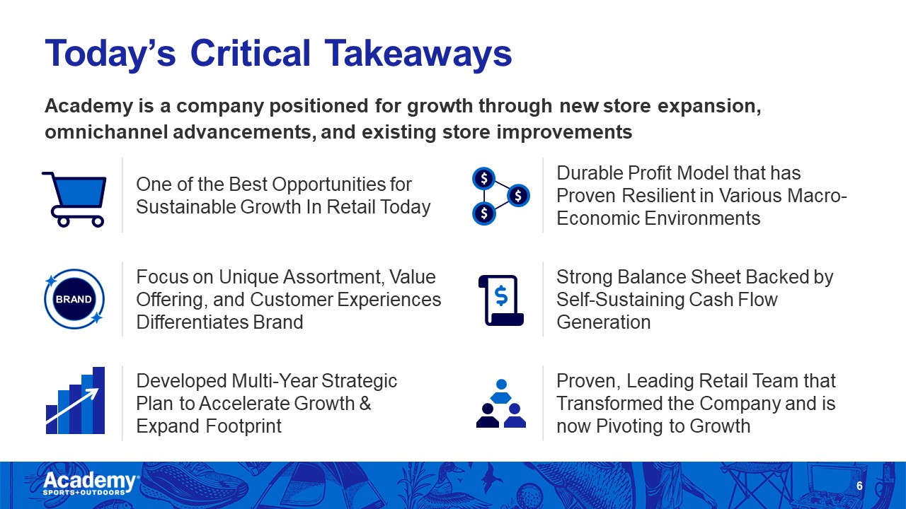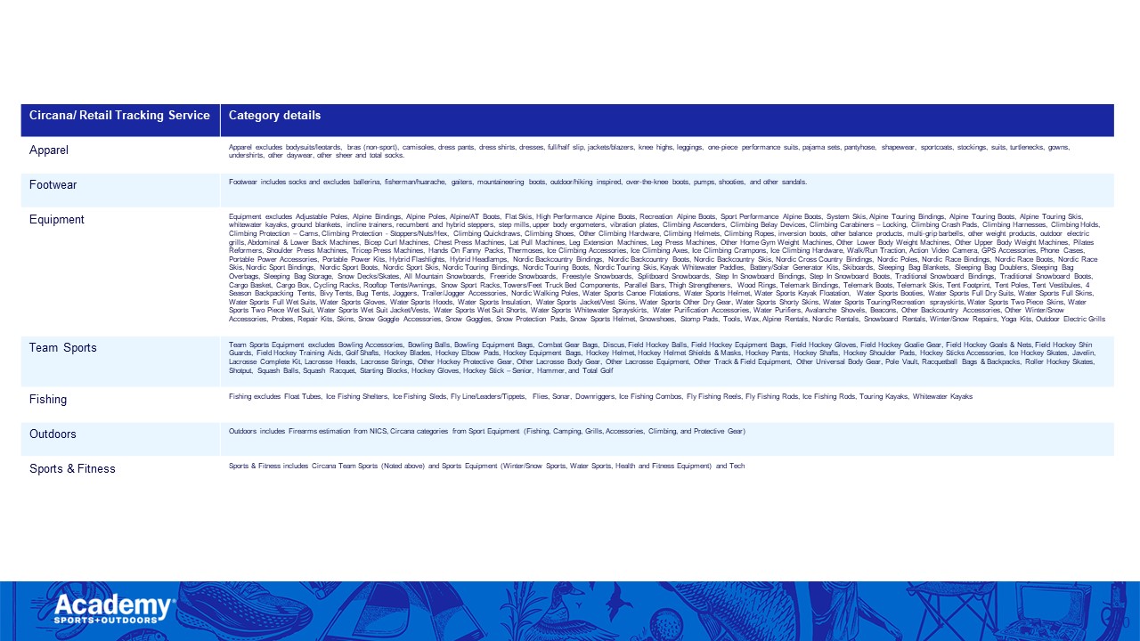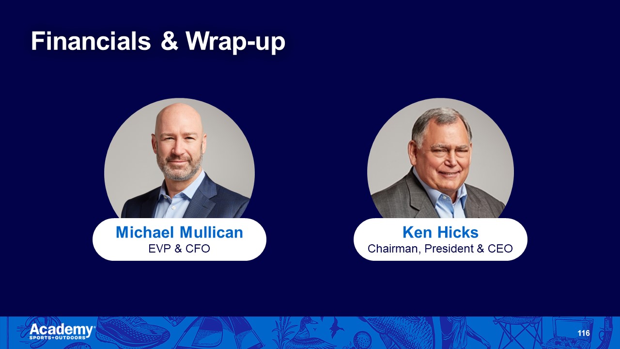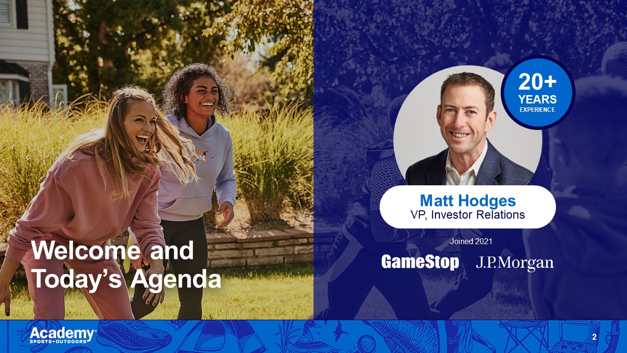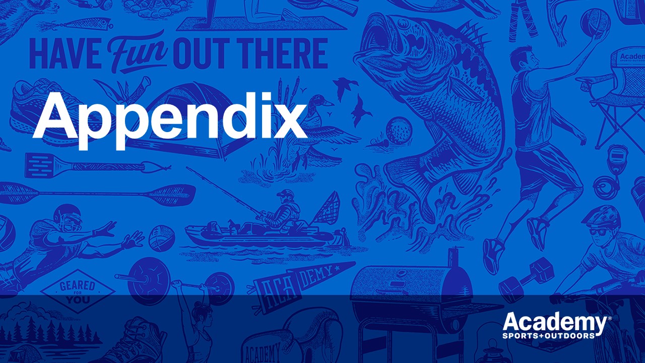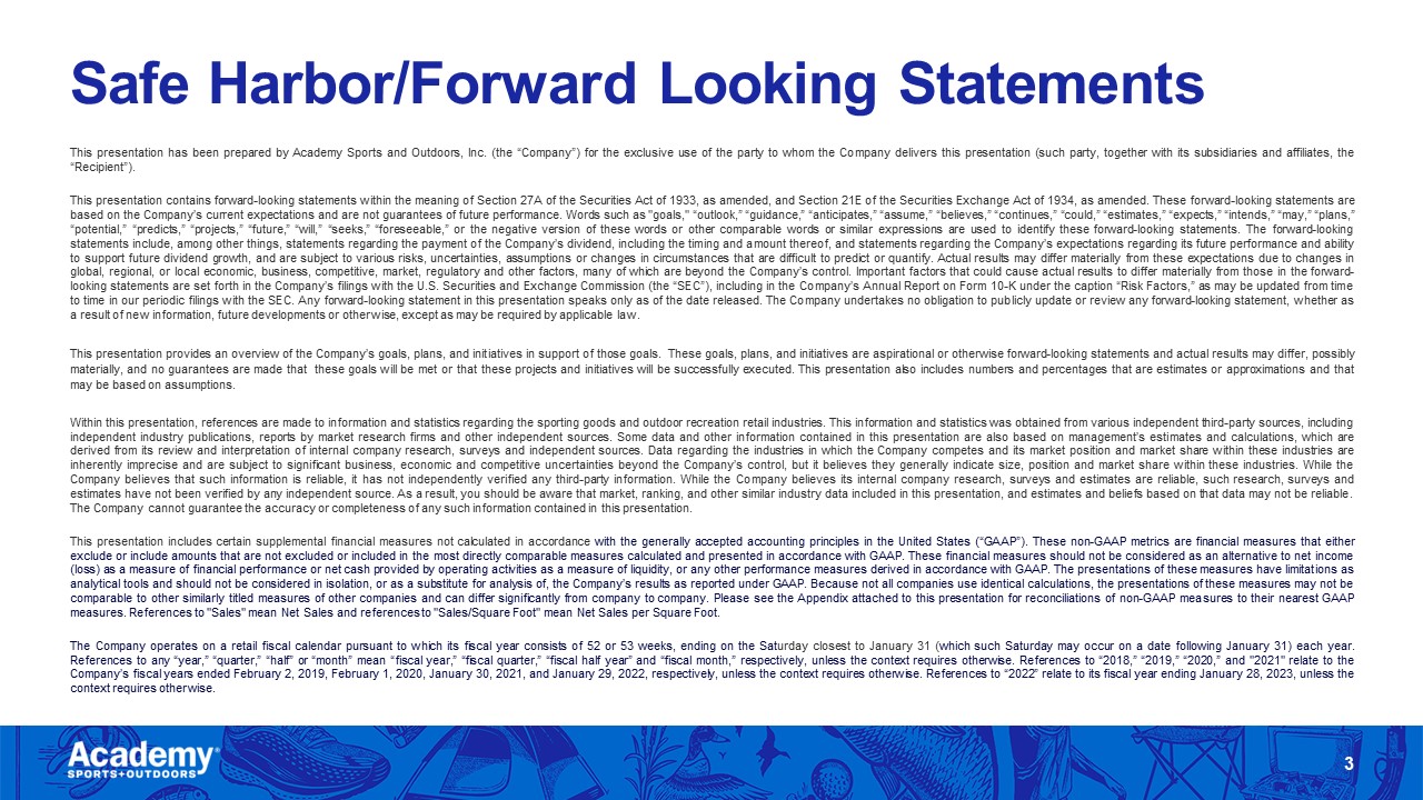 Safe Harbor/Forward Looking Statements  This presentation has been prepared by Academy Sports and Outdoors, Inc. (the “Company”) for the exclusive use of the party to whom the Company delivers this presentation (such party, together with its subsidiaries and affiliates, the “Recipient”).  This presentation contains forward-looking statements within the meaning of Section 27A of the Securities Act of 1933, as amended, and Section 21E of the Securities Exchange Act of 1934, as amended. These forward-looking statements are based on the Company’s current expectations and are not guarantees of future performance. Words such as "goals," “outlook,” “guidance,” “anticipates,” “assume,” “believes,” “continues,” “could,” “estimates,” “expects,” “intends,” “may,” “plans,” “potential,” “predicts,” “projects,” “future,” “will,” “seeks,” “foreseeable,” or the negative version of these words or other comparable words or similar expressions are used to identify these forward-looking statements. The forward-looking statements include, among other things, statements regarding the payment of the Company’s dividend, including the timing and amount thereof, and statements regarding the Company’s expectations regarding its future performance and ability to support future dividend growth, and are subject to various risks, uncertainties, assumptions or changes in circumstances that are difficult to predict or quantify. Actual results may di­ffer materially from these expectations due to changes in global, regional, or local economic, business, competitive, market, regulatory and other factors, many of which are beyond the Company’s control. Important factors that could cause actual results to di­ffer materially from those in the forward-looking statements are set forth in the Company’s filings with the U.S. Securities and Exchange Commission (the “SEC”), including in the Company’s Annual Report on Form 10-K under the caption “Risk Factors,” as may be updated from time to time in our periodic filings with the SEC. Any forward-looking statement in this presentation speaks only as of the date released. The Company undertakes no obligation to publicly update or review any forward-looking statement, whether as a result of new information, future developments or otherwise, except as may be required by applicable law.  This presentation provides an overview of the Company’s goals, plans, and initiatives in support of those goals.  These goals, plans, and initiatives are aspirational or otherwise forward-looking statements and actual results may differ, possibly materially, and no guarantees are made that  these goals will be met or that these projects and initiatives will be successfully executed. This presentation also includes numbers and percentages that are estimates or approximations and that may be based on assumptions.  Within this presentation, references are made to information and statistics regarding the sporting goods and outdoor recreation retail industries. This information and statistics was obtained from various independent third-party sources, including independent industry publications, reports by market research firms and other independent sources. Some data and other information contained in this presentation are also based on management’s estimates and calculations, which are derived from its review and interpretation of internal company research, surveys and independent sources. Data regarding the industries in which the Company competes and its market position and market share within these industries are inherently imprecise and are subject to significant business, economic and competitive uncertainties beyond the Company’s control, but it believes they generally indicate size, position and market share within these industries. While the Company believes that such information is reliable, it has not independently verified any third-party information. While the Company believes its internal company research, surveys and estimates are reliable, such research, surveys and estimates have not been verified by any independent source. As a result, you should be aware that market, ranking, and other similar industry data included in this presentation, and estimates and beliefs based on that data may not be reliable. The Company cannot guarantee the accuracy or completeness of any such information contained in this presentation.  This presentation includes certain supplemental financial measures not calculated in accordance with the generally accepted accounting principles in the United States (“GAAP”). These non-GAAP metrics are financial measures that either exclude or include amounts that are not excluded or included in the most directly comparable measures calculated and presented in accordance with GAAP. These financial measures should not be considered as an alternative to net income (loss) as a measure of financial performance or net cash provided by operating activities as a measure of liquidity, or any other performance measures derived in accordance with GAAP. The presentations of these measures have limitations as analytical tools and should not be considered in isolation, or as a substitute for analysis of, the Company’s results as reported under GAAP. Because not all companies use identical calculations, the presentations of these measures may not be comparable to other similarly titled measures of other companies and can differ significantly from company to company. Please see the Appendix attached to this presentation for reconciliations of non-GAAP measures to their nearest GAAP measures. References to "Sales" mean Net Sales and references to "Sales/Square Foot" mean Net Sales per Square Foot.  The Company operates on a retail fiscal calendar pursuant to which its fiscal year consists of 52 or 53 weeks, ending on the Saturday closest to January 31 (which such