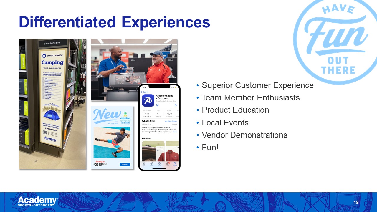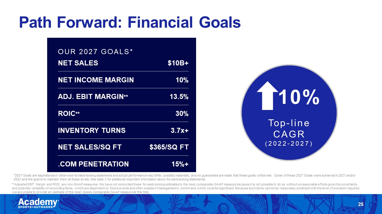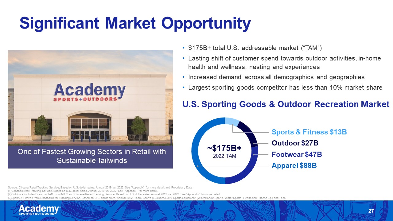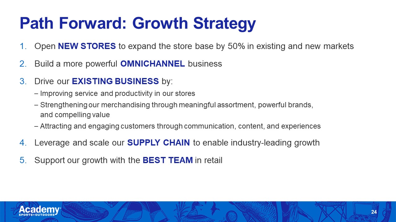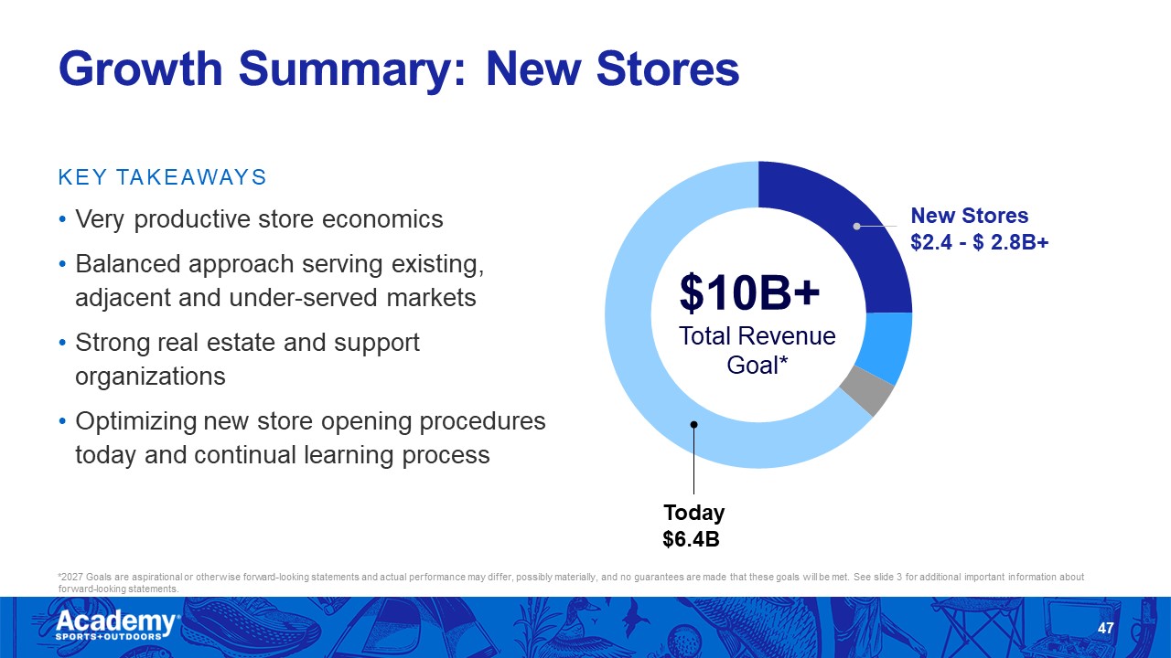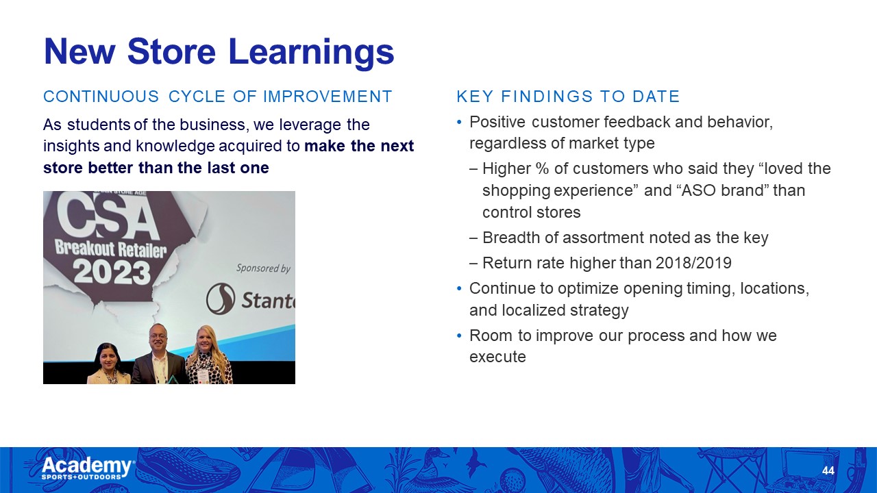 Safe Harbor/Forward Looking Statements  This presentation has been prepared by Academy Sports and Outdoors, Inc. (the “Company”) for the exclusive use of the party to whom the Company delivers this presentation (such party, together with its subsidiaries and affiliates, the “Recipient”).  This presentation contains forward-looking statements within the meaning of Section 27A of the Securities Act of 1933, as amended, and Section 21E of the Securities Exchange Act of 1934, as amended. These forward-looking statements are based on the Company’s current expectations and are not guarantees of future performance. Words such as "goals," “outlook,” “guidance,” “anticipates,” “assume,” “believes,” “continues,” “could,” “estimates,” “expects,” “intends,” “may,” “plans,” “potential,” “predicts,” “projects,” “future,” “will,” “seeks,” “foreseeable,” or the negative version of these words or other comparable words or similar expressions are used to identify these forward-looking statements. The forward-looking statements include, among other things, statements regarding the payment of the Company’s dividend, including the timing and amount thereof, and statements regarding the Company’s expectations regarding its future performance and ability to support future dividend growth, and are subject to various risks, uncertainties, assumptions or changes in circumstances that are difficult to predict or quantify. Actual results may di­ffer materially from these expectations due to changes in global, regional, or local economic, business, competitive, market, regulatory and other factors, many of which are beyond the Company’s control. Important factors that could cause actual results to di­ffer materially from those in the forward-looking statements are set forth in the Company’s filings with the U.S. Securities and Exchange Commission (the “SEC”), including in the Company’s Annual Report on Form 10-K under the caption “Risk Factors,” as may be updated from time to time in our periodic filings with the SEC. Any forward-looking statement in this presentation speaks only as of the date released. The Company undertakes no obligation to publicly update or review any forward-looking statement, whether as a result of new information, future developments or otherwise, except as may be required by applicable law.  This presentation provides an overview of the Company’s goals, plans, and initiatives in support of those goals.  These goals, plans, and initiatives are aspirational or otherwise forward-looking statements and actual results may differ, possibly materially, and no guarantees are made that  these goals will be met or that these projects and initiatives will be successfully executed. This presentation also includes numbers and percentages that are estimates or approximations and that may be based on assumptions.  Within this presentation, references are made to information and statistics regarding the sporting goods and outdoor recreation retail industries. This information and statistics was obtained from various independent third-party sources, including independent industry publications, reports by market research firms and other independent sources. Some data and other information contained in this presentation are also based on management’s estimates and calculations, which are derived from its review and interpretation of internal company research, surveys and independent sources. Data regarding the industries in which the Company competes and its market position and market share within these industries are inherently imprecise and are subject to significant business, economic and competitive uncertainties beyond the Company’s control, but it believes they generally indicate size, position and market share within these industries. While the Company believes that such information is reliable, it has not independently verified any third-party information. While the Company believes its internal company research, surveys and estimates are reliable, such research, surveys and estimates have not been verified by any independent source. As a result, you should be aware that market, ranking, and other similar industry data included in this presentation, and estimates and beliefs based on that data may not be reliable. The Company cannot guarantee the accuracy or completeness of any such information contained in this presentation.  This presentation includes certain supplemental financial measures not calculated in accordance with the generally accepted accounting principles in the United States (“GAAP”). These non-GAAP metrics are financial measures that either exclude or include amounts that are not excluded or included in the most directly comparable measures calculated and presented in accordance with GAAP. These financial measures should not be considered as an alternative to net income (loss) as a measure of financial performance or net cash provided by operating activities as a measure of liquidity, or any other performance measures derived in accordance with GAAP. The presentations of these measures have limitations as analytical tools and should not be considered in isolation, or as a substitute for analysis of, the Company’s results as reported under GAAP. Because not all companies use identical calculations, the presentations of these measures may not be comparable to other similarly titled measures of other companies and can differ significantly from company to company. Please see the Appendix attached to this presentation for reconciliations of non-GAAP measures to their nearest GAAP measures. References to "Sales" mean Net Sales and references to "Sales/Square Foot" mean Net Sales per Square Foot.  The Company operates on a retail fiscal calendar pursuant to which its fiscal year consists of 52 or 53 weeks, ending on the Saturday closest to January 31 (which such
