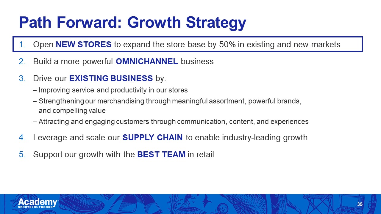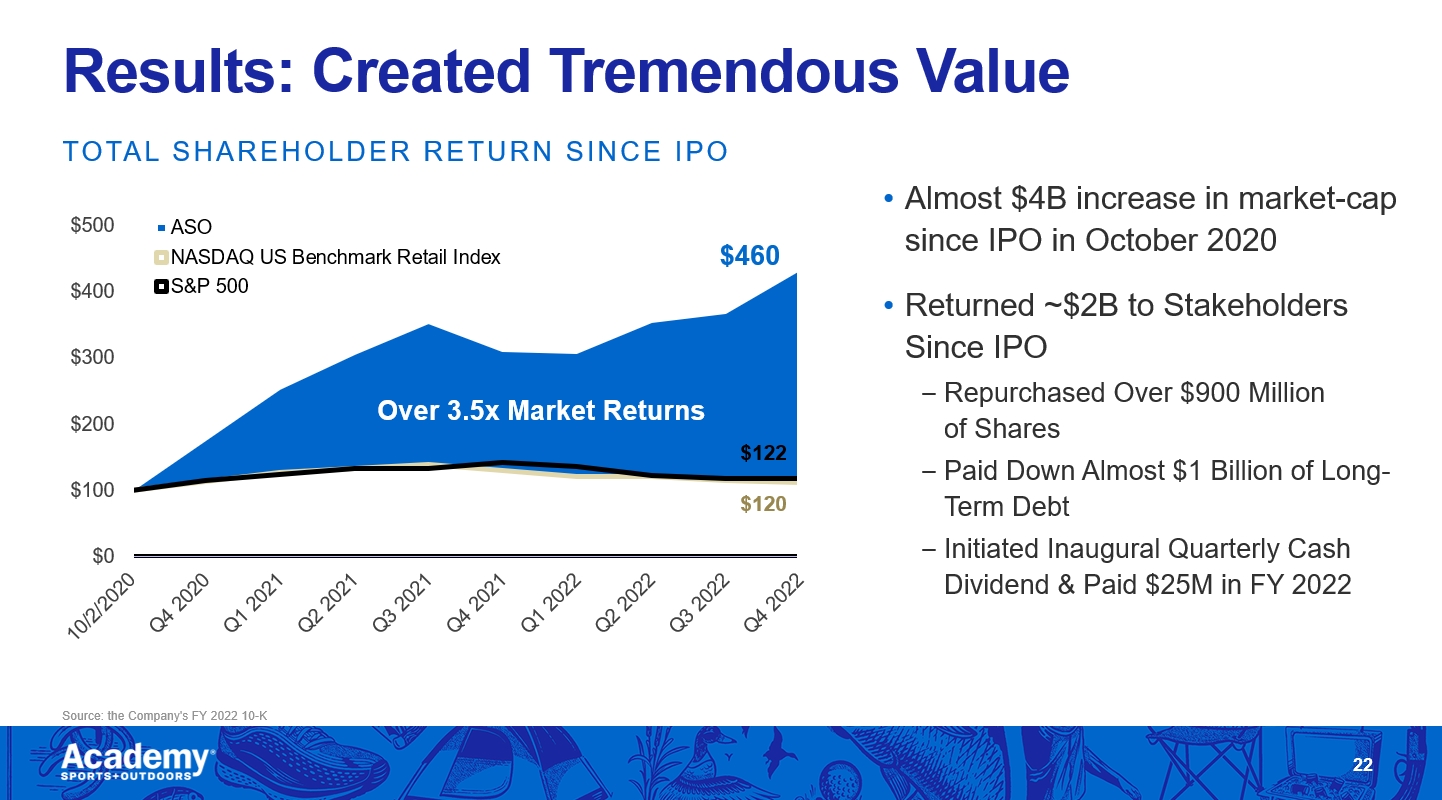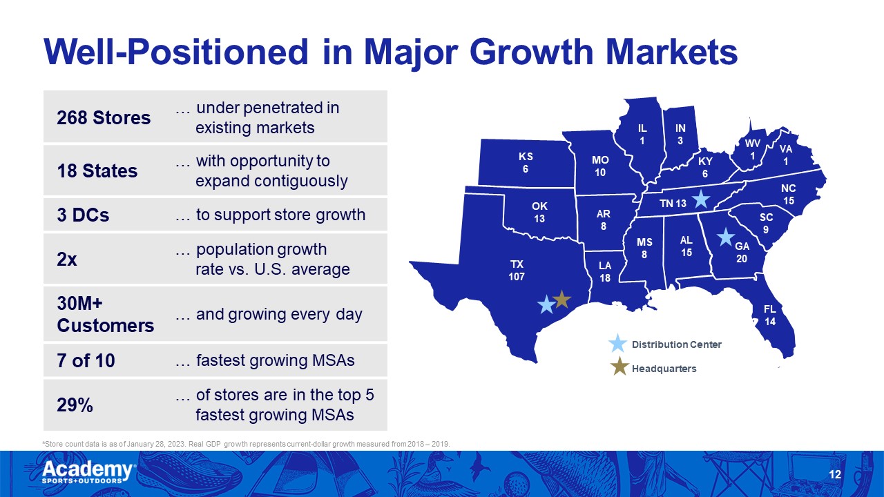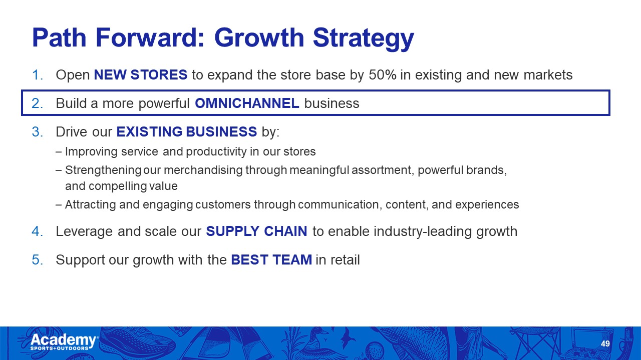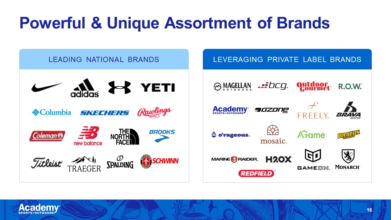 Safe Harbor/Forward Looking Statements  This presentation has been prepared by Academy Sports and Outdoors, Inc. (the “Company”) for the exclusive use of the party to whom the Company delivers this presentation (such party, together with its subsidiaries and affiliates, the “Recipient”).  This presentation contains forward-looking statements within the meaning of Section 27A of the Securities Act of 1933, as amended, and Section 21E of the Securities Exchange Act of 1934, as amended. These forward-looking statements are based on the Company’s current expectations and are not guarantees of future performance. Words such as "goals," “outlook,” “guidance,” “anticipates,” “assume,” “believes,” “continues,” “could,” “estimates,” “expects,” “intends,” “may,” “plans,” “potential,” “predicts,” “projects,” “future,” “will,” “seeks,” “foreseeable,” or the negative version of these words or other comparable words or similar expressions are used to identify these forward-looking statements. The forward-looking statements include, among other things, statements regarding the payment of the Company’s dividend, including the timing and amount thereof, and statements regarding the Company’s expectations regarding its future performance and ability to support future dividend growth, and are subject to various risks, uncertainties, assumptions or changes in circumstances that are difficult to predict or quantify. Actual results may di­ffer materially from these expectations due to changes in global, regional, or local economic, business, competitive, market, regulatory and other factors, many of which are beyond the Company’s control. Important factors that could cause actual results to di­ffer materially from those in the forward-looking statements are set forth in the Company’s filings with the U.S. Securities and Exchange Commission (the “SEC”), including in the Company’s Annual Report on Form 10-K under the caption “Risk Factors,” as may be updated from time to time in our periodic filings with the SEC. Any forward-looking statement in this presentation speaks only as of the date released. The Company undertakes no obligation to publicly update or review any forward-looking statement, whether as a result of new information, future developments or otherwise, except as may be required by applicable law.  This presentation provides an overview of the Company’s goals, plans, and initiatives in support of those goals.  These goals, plans, and initiatives are aspirational or otherwise forward-looking statements and actual results may differ, possibly materially, and no guarantees are made that  these goals will be met or that these projects and initiatives will be successfully executed. This presentation also includes numbers and percentages that are estimates or approximations and that may be based on assumptions.  Within this presentation, references are made to information and statistics regarding the sporting goods and outdoor recreation retail industries. This information and statistics was obtained from various independent third-party sources, including independent industry publications, reports by market research firms and other independent sources. Some data and other information contained in this presentation are also based on management’s estimates and calculations, which are derived from its review and interpretation of internal company research, surveys and independent sources. Data regarding the industries in which the Company competes and its market position and market share within these industries are inherently imprecise and are subject to significant business, economic and competitive uncertainties beyond the Company’s control, but it believes they generally indicate size, position and market share within these industries. While the Company believes that such information is reliable, it has not independently verified any third-party information. While the Company believes its internal company research, surveys and estimates are reliable, such research, surveys and estimates have not been verified by any independent source. As a result, you should be aware that market, ranking, and other similar industry data included in this presentation, and estimates and beliefs based on that data may not be reliable. The Company cannot guarantee the accuracy or completeness of any such information contained in this presentation.  This presentation includes certain supplemental financial measures not calculated in accordance with the generally accepted accounting principles in the United States (“GAAP”). These non-GAAP metrics are financial measures that either exclude or include amounts that are not excluded or included in the most directly comparable measures calculated and presented in accordance with GAAP. These financial measures should not be considered as an alternative to net income (loss) as a measure of financial performance or net cash provided by operating activities as a measure of liquidity, or any other performance measures derived in accordance with GAAP. The presentations of these measures have limitations as analytical tools and should not be considered in isolation, or as a substitute for analysis of, the Company’s results as reported under GAAP. Because not all companies use identical calculations, the presentations of these measures may not be comparable to other similarly titled measures of other companies and can differ significantly from company to company. Please see the Appendix attached to this presentation for reconciliations of non-GAAP measures to their nearest GAAP measures. References to "Sales" mean Net Sales and references to "Sales/Square Foot" mean Net Sales per Square Foot.  The Company operates on a retail fiscal calendar pursuant to which its fiscal year consists of 52 or 53 weeks, ending on the Saturday closest to January 31 (which such