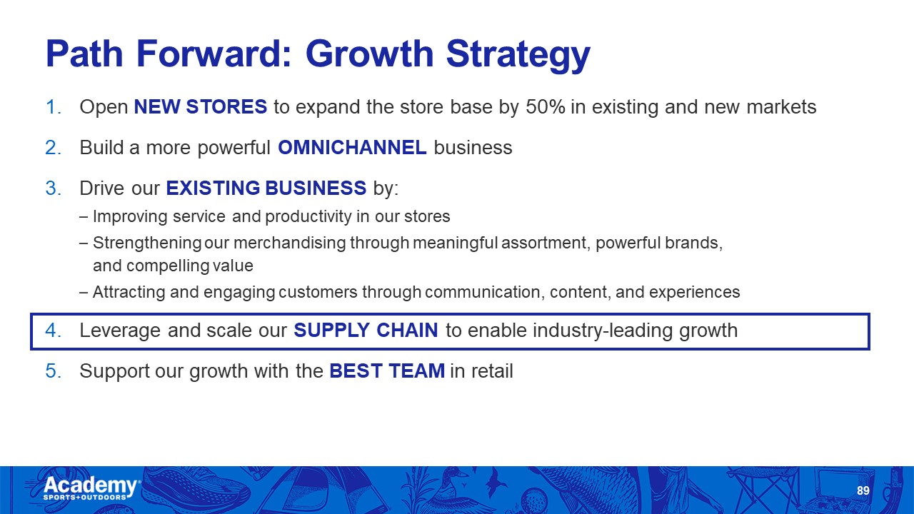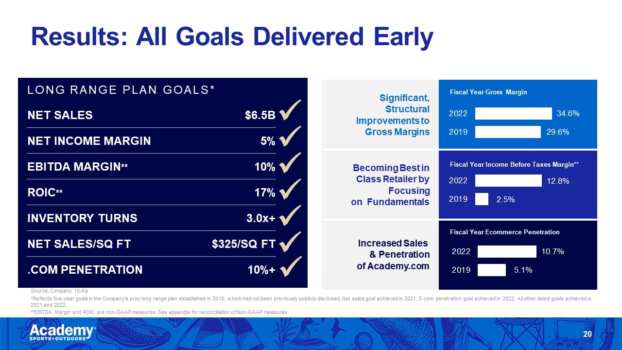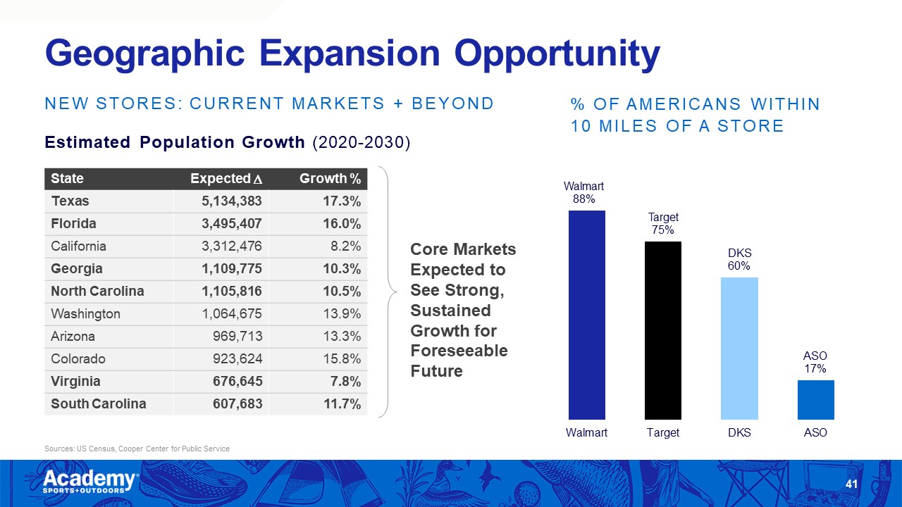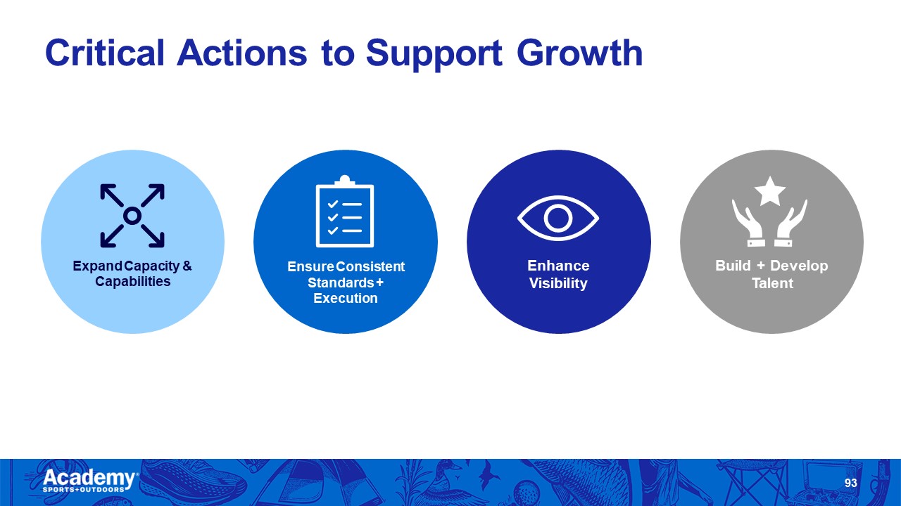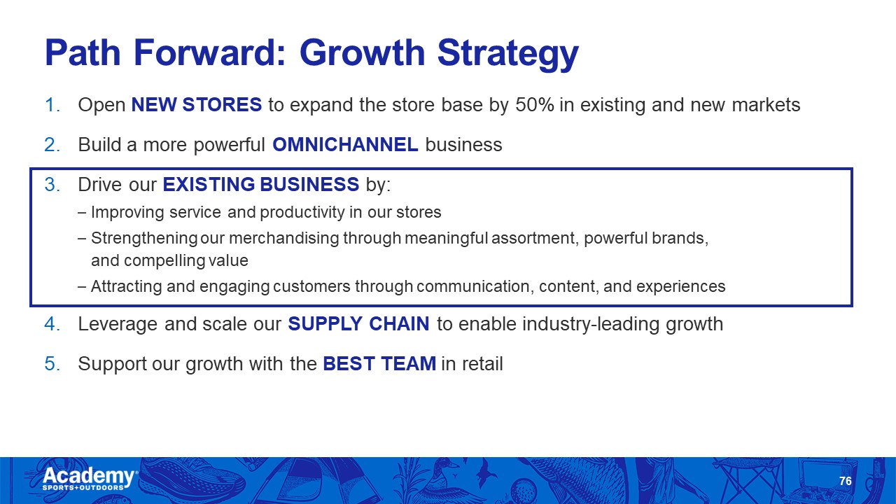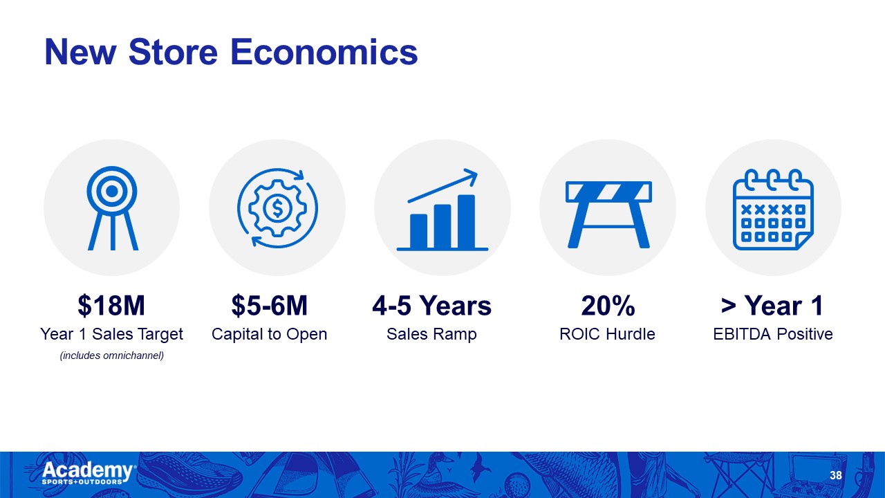 Safe Harbor/Forward Looking Statements  This presentation has been prepared by Academy Sports and Outdoors, Inc. (the “Company”) for the exclusive use of the party to whom the Company delivers this presentation (such party, together with its subsidiaries and affiliates, the “Recipient”).  This presentation contains forward-looking statements within the meaning of Section 27A of the Securities Act of 1933, as amended, and Section 21E of the Securities Exchange Act of 1934, as amended. These forward-looking statements are based on the Company’s current expectations and are not guarantees of future performance. Words such as "goals," “outlook,” “guidance,” “anticipates,” “assume,” “believes,” “continues,” “could,” “estimates,” “expects,” “intends,” “may,” “plans,” “potential,” “predicts,” “projects,” “future,” “will,” “seeks,” “foreseeable,” or the negative version of these words or other comparable words or similar expressions are used to identify these forward-looking statements. The forward-looking statements include, among other things, statements regarding the payment of the Company’s dividend, including the timing and amount thereof, and statements regarding the Company’s expectations regarding its future performance and ability to support future dividend growth, and are subject to various risks, uncertainties, assumptions or changes in circumstances that are difficult to predict or quantify. Actual results may di­ffer materially from these expectations due to changes in global, regional, or local economic, business, competitive, market, regulatory and other factors, many of which are beyond the Company’s control. Important factors that could cause actual results to di­ffer materially from those in the forward-looking statements are set forth in the Company’s filings with the U.S. Securities and Exchange Commission (the “SEC”), including in the Company’s Annual Report on Form 10-K under the caption “Risk Factors,” as may be updated from time to time in our periodic filings with the SEC. Any forward-looking statement in this presentation speaks only as of the date released. The Company undertakes no obligation to publicly update or review any forward-looking statement, whether as a result of new information, future developments or otherwise, except as may be required by applicable law.  This presentation provides an overview of the Company’s goals, plans, and initiatives in support of those goals.  These goals, plans, and initiatives are aspirational or otherwise forward-looking statements and actual results may differ, possibly materially, and no guarantees are made that  these goals will be met or that these projects and initiatives will be successfully executed. This presentation also includes numbers and percentages that are estimates or approximations and that may be based on assumptions.  Within this presentation, references are made to information and statistics regarding the sporting goods and outdoor recreation retail industries. This information and statistics was obtained from various independent third-party sources, including independent industry publications, reports by market research firms and other independent sources. Some data and other information contained in this presentation are also based on management’s estimates and calculations, which are derived from its review and interpretation of internal company research, surveys and independent sources. Data regarding the industries in which the Company competes and its market position and market share within these industries are inherently imprecise and are subject to significant business, economic and competitive uncertainties beyond the Company’s control, but it believes they generally indicate size, position and market share within these industries. While the Company believes that such information is reliable, it has not independently verified any third-party information. While the Company believes its internal company research, surveys and estimates are reliable, such research, surveys and estimates have not been verified by any independent source. As a result, you should be aware that market, ranking, and other similar industry data included in this presentation, and estimates and beliefs based on that data may not be reliable. The Company cannot guarantee the accuracy or completeness of any such information contained in this presentation.  This presentation includes certain supplemental financial measures not calculated in accordance with the generally accepted accounting principles in the United States (“GAAP”). These non-GAAP metrics are financial measures that either exclude or include amounts that are not excluded or included in the most directly comparable measures calculated and presented in accordance with GAAP. These financial measures should not be considered as an alternative to net income (loss) as a measure of financial performance or net cash provided by operating activities as a measure of liquidity, or any other performance measures derived in accordance with GAAP. The presentations of these measures have limitations as analytical tools and should not be considered in isolation, or as a substitute for analysis of, the Company’s results as reported under GAAP. Because not all companies use identical calculations, the presentations of these measures may not be comparable to other similarly titled measures of other companies and can differ significantly from company to company. Please see the Appendix attached to this presentation for reconciliations of non-GAAP measures to their nearest GAAP measures. References to "Sales" mean Net Sales and references to "Sales/Square Foot" mean Net Sales per Square Foot.  The Company operates on a retail fiscal calendar pursuant to which its fiscal year consists of 52 or 53 weeks, ending on the Saturday closest to January 31 (which such