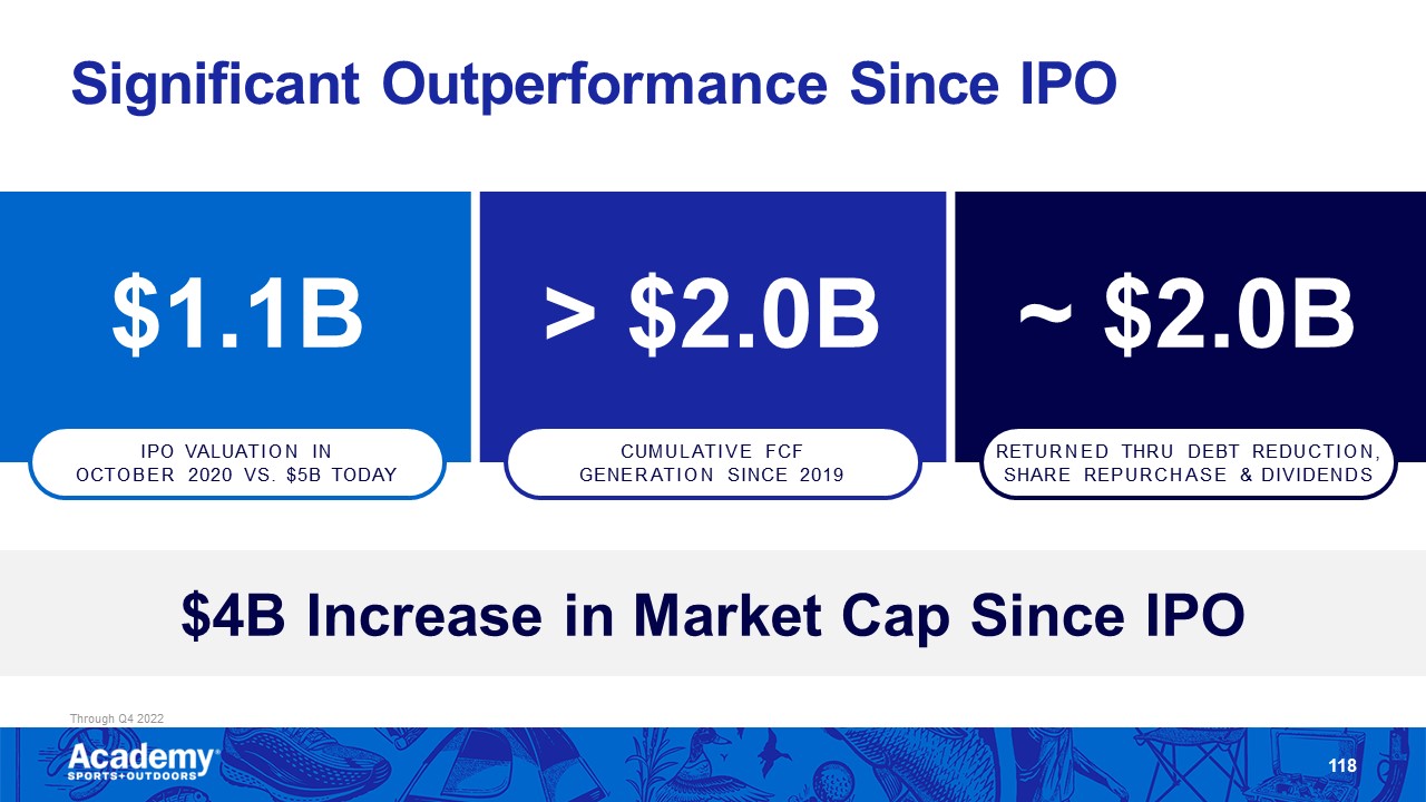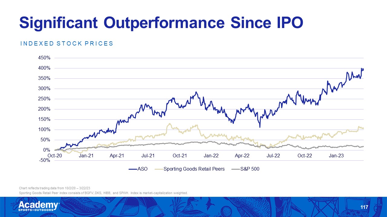 117  Significant Outperformance Since IPO  Chart reflects trading data from 10/2/20 – 3/22/23  Sporting Goods Retail Peer index consists of BGFV, DKS, HIBB, and SPWH. Index is market-capitalization weighted.