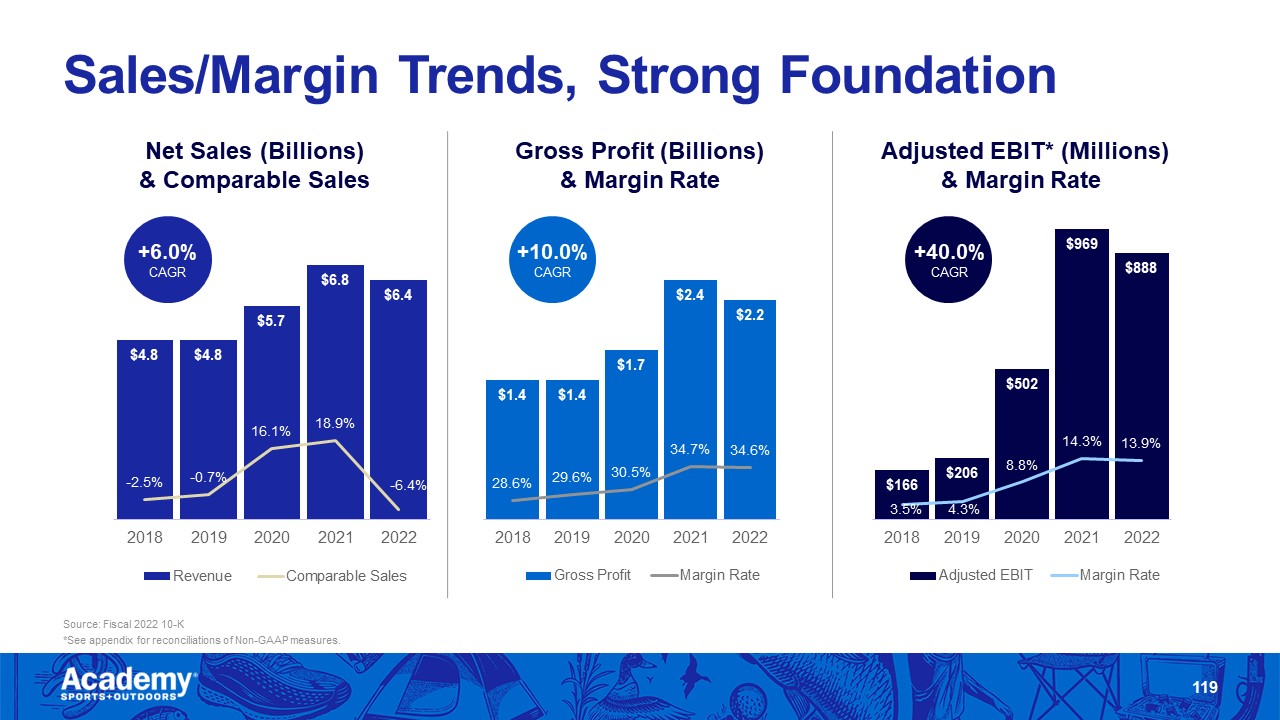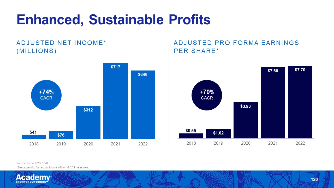 Sales/Margin Trends, Strong Foundation  Net Sales (Billions) & Comparable Sales  Gross Profit (Billions) & Margin Rate  Adjusted EBIT* (Millions)   & Margin Rate   119  Source: Fiscal 2022 10-K  *See appendix for reconciliations of Non-GAAP measures.  +40.0%  CAGR  +10.0%  CAGR  +6.0%  CAGR