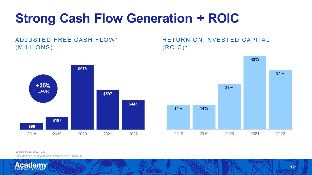 Strong Cash Flow Generation + ROIC  Adjusted Free Cash Flow*(Millions)  121  Source: Fiscal 2022 10-K  *See appendix for reconciliations of Non-GAAP measures.  Return on Invested Capital (ROIC)*  +35%  CAGR