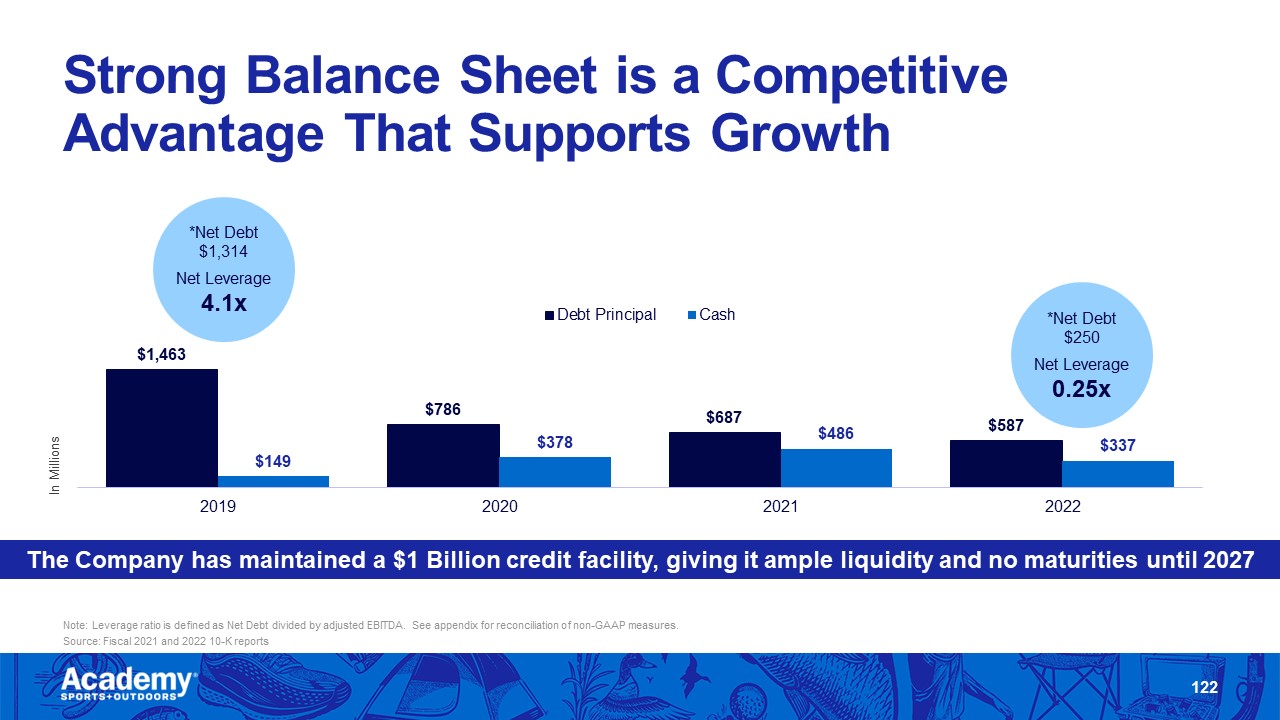Strong Balance Sheet is a Competitive Advantage That Supports Growth  122  Note: Leverage ratio is defined as Net Debt divided by adjusted EBITDA. See appendix for reconciliation of non-GAAP measures.  Source: Fiscal 2021 and 2022 10-K reports  *Net Debt  $1,314  Net Leverage  4.1x  *Net Debt  $250  Net Leverage  0.25x  In Millions  The Company has maintained a $1 Billion credit facility, giving it ample liquidity and no maturities until 2027