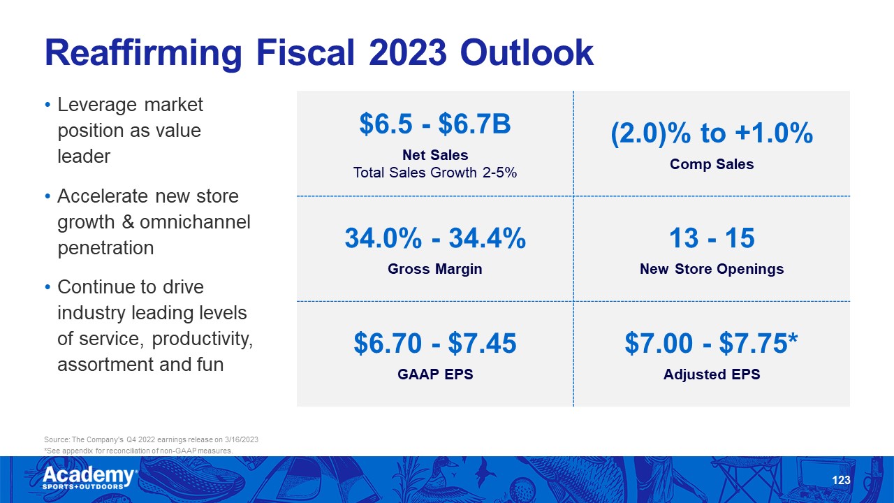 Reaffirming Fiscal 2023 Outlook  Leverage market position as value leader  Accelerate new store growth & omnichannel penetration  Continue to drive industry leading levels of service, productivity, assortment and fun  123  $6.5 - $6.7B  Net SalesTotal Sales Growth 2-5%  (2.0)% to +1.0%  Comp Sales  34.0% - 34.4%  Gross Margin  13 - 15  New Store Openings  $6.70 - $7.45  GAAP EPS  $7.00 - $7.75*  Adjusted EPS  Source: The Company's Q4 2022 earnings release on 3/16/2023  *See appendix for reconciliation of non-GAAP measures.