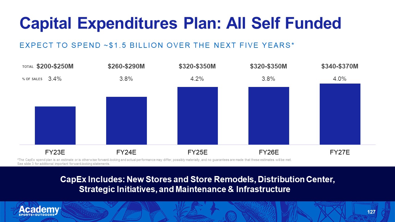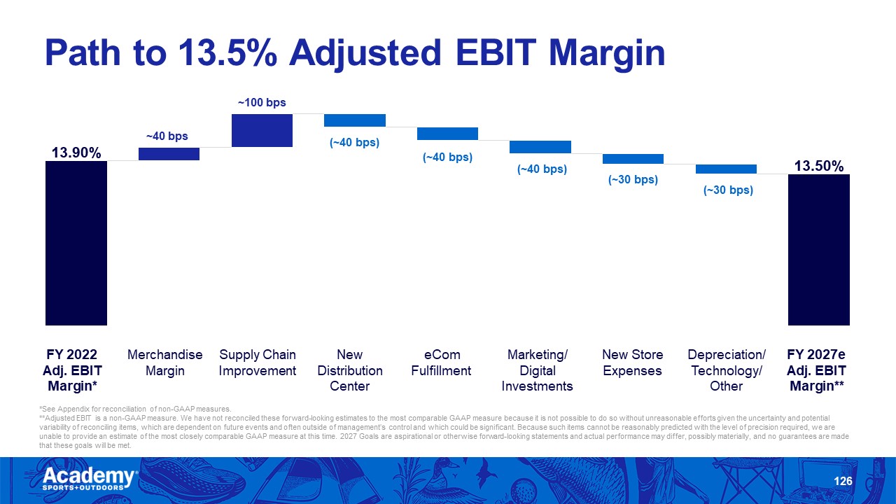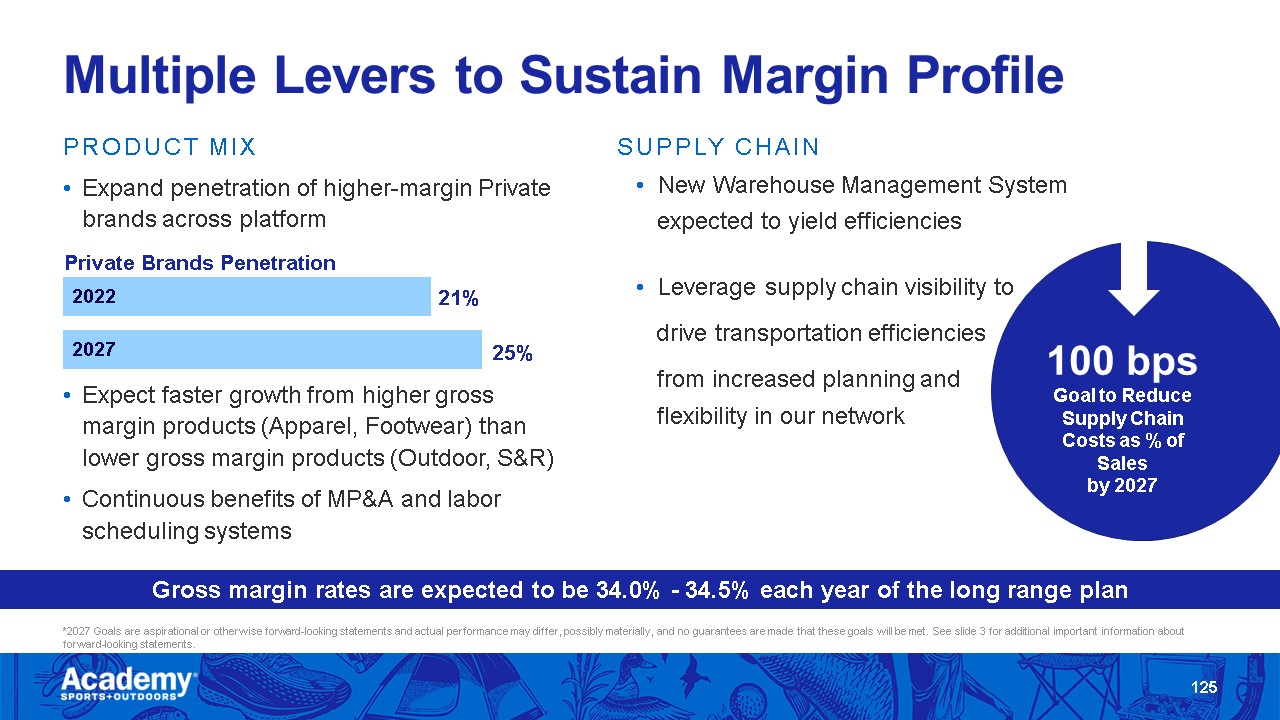 Multiple Levers to Sustain Margin Profile  Product Mix  Expand penetration of higher-margin Private brands across platform   125  Supply Chain    New Warehouse Management System        expected to yield efficiencies           Leverage supply chain visibility to     drive transportation efficiencies        from increased planning and        flexibility in our network  25%  21%  2027  2022  Private Brands Penetration  100 bps  Goal to Reduce Supply Chain Costs as % of Sales by 2027  Expect faster growth from higher gross margin products (Apparel, Footwear) than lower gross margin products (Outdoor, S&R)  Continuous benefits of MP&A and labor scheduling systems  Gross margin rates are expected to be 34.0% - 34.5% each year of the long range plan  *2027 Goals are aspirational or otherwise forward-looking statements and actual performance may differ, possibly materially, and no guarantees are made that these goals will be met. See slide 3 for additional important information about forward-looking statements.