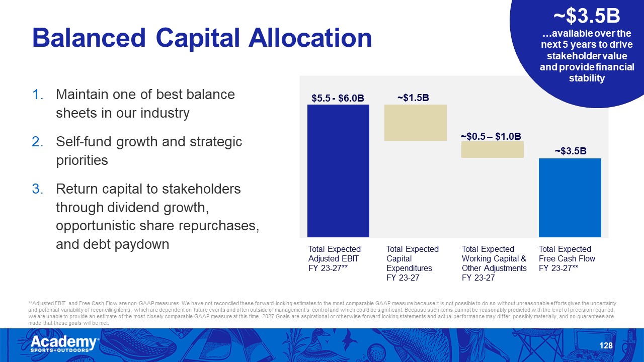 ~$3.5B  …available over the next 5 years to drive stakeholder value and provide financial stability  Balanced Capital Allocation  Maintain one of best balance sheets in our industry  Self-fund growth and strategic priorities   Return capital to stakeholders through dividend growth, opportunistic share repurchases, and debt paydown  128  ~$0.5 – $1.0B  $5.5 - $6.0B  ~$3.5B  ~$1.5B  Total Expected Adjusted EBIT   FY 23-27**  Total Expected Capital Expenditures  FY 23-27  Total Expected Working Capital & Other Adjustments  FY 23-27  Total Expected Free Cash Flow  FY 23-27**  **Adjusted EBIT and Free Cash Flow are non-GAAP measures. We have not reconciled these forward-looking estimates to the most comparable GAAP measure because it is not possible to do so without unreasonable efforts given the uncertainty and potential variability of reconciling items, which are dependent on future events and often outside of management’s control and which could be significant. Because such items cannot be reasonably predicted with the level of precision required, we are unable to provide an estimate of the most closely comparable GAAP measure at this time. 2027 Goals are aspirational or otherwise forward-looking statements and actual performance may differ, possibly materially, and no guarantees are made that these goals will be met.