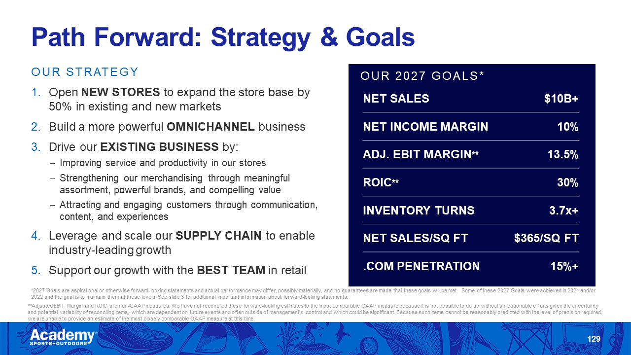 Path Forward: Strategy & Goals  OUR STRATEGY  Open NEW STORES to expand the store base by 50% in existing and new markets  Build a more powerful OMNICHANNEL business  Drive our EXISTING BUSINESS by:  Improving service and productivity in our stores  Strengthening our merchandising through meaningful assortment, powerful brands, and compelling value   Attracting and engaging customers through communication, content, and experiences  Leverage and scale our SUPPLY CHAIN to enable industry-leading growth  Support our growth with the BEST TEAM in retail  129  Our 2027 Goals*  NET SALES  $10B+  NET INCOME MARGIN  10%  ADJ. EBIT MARGIN**  13.5%  ROIC**  30%  INVENTORY TURNS  3.7x+  NET SALES/SQ FT  $365/SQ FT  .COM PENETRATION  15%+  *2027 Goals are aspirational or otherwise forward-looking statements and actual performance may differ, possibly materially, and no guarantees are made that these goals will be met.  Some of these 2027 Goals were achieved in 2021 and/or 2022 and the goal is to maintain them at these levels. See slide 3 for additional important information about forward-looking statements.  **Adjusted EBIT Margin and ROIC are non-GAAP measures. We have not reconciled these forward-looking estimates to the most comparable GAAP measure because it is not possible to do so without unreasonable efforts given the uncertainty and potential variability of reconciling items, which are dependent on future events and often outside of management’s control and which could be significant. Because such items cannot be reasonably predicted with the level of precision required, we are unable to provide an estimate of the most closely comparable GAAP measure at this time.