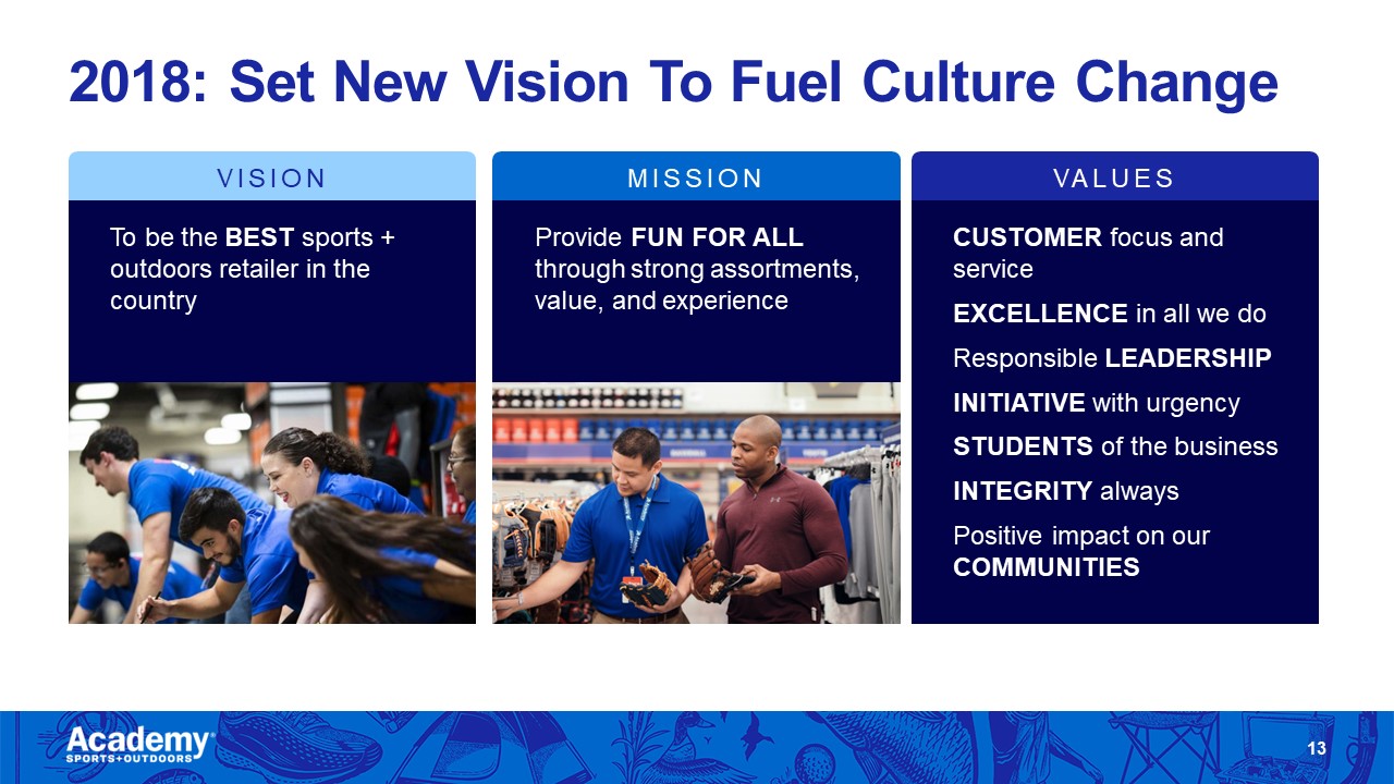 2018: Set New Vision To Fuel Culture Change  13  VALUES  CUSTOMER focus and service  EXCELLENCE in all we do  Responsible LEADERSHIP  INITIATIVE with urgency  STUDENTS of the business  INTEGRITY always   Positive impact on our COMMUNITIES  VISION  To be the BEST sports + outdoors retailer in the country  MISSION  Provide FUN FOR ALL through strong assortments, value, and experience