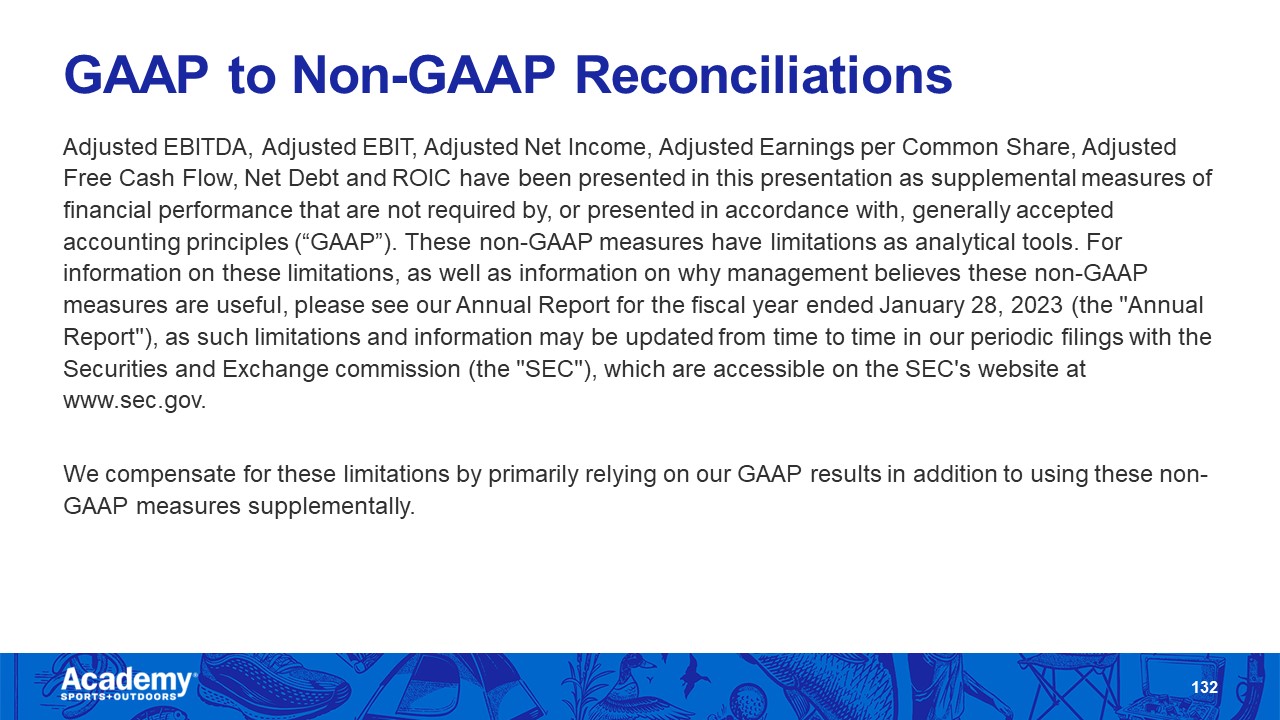 GAAP to Non-GAAP Reconciliations  Adjusted EBITDA, Adjusted EBIT, Adjusted Net Income, Adjusted Earnings per Common Share, Adjusted Free Cash Flow, Net Debt and ROIC have been presented in this presentation as supplemental measures of financial performance that are not required by, or presented in accordance with, generally accepted accounting principles (“GAAP”). These non-GAAP measures have limitations as analytical tools. For information on these limitations, as well as information on why management believes these non-GAAP measures are useful, please see our Annual Report for the fiscal year ended January 28, 2023 (the "Annual Report"), as such limitations and information may be updated from time to time in our periodic filings with the Securities and Exchange commission (the "SEC"), which are accessible on the SEC's website at www.sec.gov.  We compensate for these limitations by primarily relying on our GAAP results in addition to using these non-GAAP measures supplementally.  132