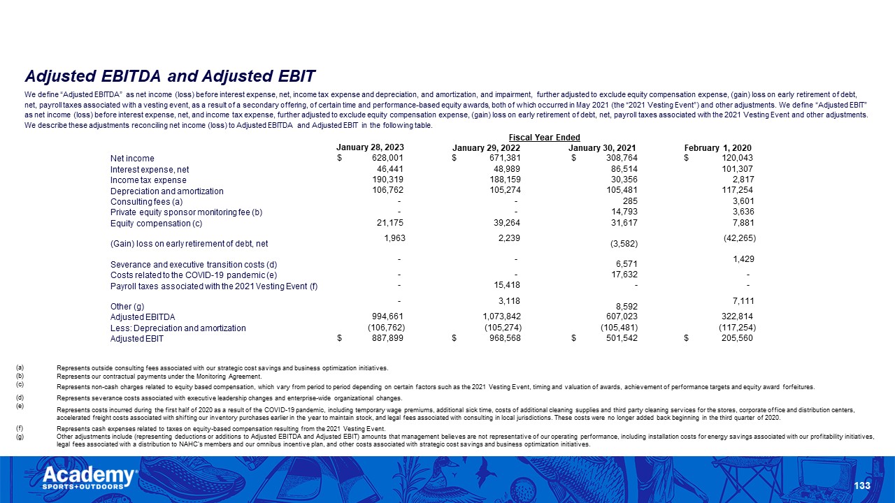 We define “Adjusted EBITDA” as net income (loss) before interest expense, net, income tax expense and depreciation, and amortization, and impairment, further adjusted to exclude equity compensation expense, (gain) loss on early retirement of debt, net, payroll taxes associated with a vesting event, as a result of a secondary offering, of certain time and performance-based equity awards, both of which occurred in May 2021 (the “2021 Vesting Event”) and other adjustments. We define “Adjusted EBIT” as net income (loss) before interest expense, net, and income tax expense, further adjusted to exclude equity compensation expense, (gain) loss on early retirement of debt, net, payroll taxes associated with the 2021 Vesting Event and other adjustments. We describe these adjustments reconciling net income (loss) to Adjusted EBITDA and Adjusted EBIT in the following table.  133  Adjusted EBITDA and Adjusted EBIT  Fiscal Year Ended  Fiscal Year Ended  January 28, 2023  January 29, 2022  January 30, 2021  February 1, 2020  Net income   $ 628,001    $ 671,381    $ 308,764    $ 120,043   Interest expense, net   46,441    48,989    86,514    101,307   Income tax expense   190,319    188,159    30,356    2,817   Depreciation and amortization   106,762    105,274    105,481    117,254   Consulting fees (a)   -    -    285    3,601   Private equity sponsor monitoring fee (b)   -    -    14,793    3,636   Equity compensation (c)   21,175    39,264    31,617    7,881   (Gain) loss on early retirement of debt, net   1,963    2,239    (3,582)   (42,265)  Severance and executive transition costs (d)   -    -    6,571    1,429   Costs related to the COVID-19 pandemic (e)   -    -    17,632    -   Payroll taxes associated with the 2021 Vesting Event (f)   -    15,418    -    -   Other (g)   -    3,118    8,592    7,111   Adjusted EBITDA   994,661    1,073,842    607,023    322,814   Less: Depreciation and amortization   (106,762)   (105,274)   (105,481)   (117,254)  Adjusted EBIT   $ 887,899    $ 968,568    $ 501,542    $ 205,560   (a)  Represents outside consulting fees associated with our strategic cost savings and business optimization initiatives.  (b)  Represents our contractual payments under the Monitoring Agreement.   (c)  Represents non-cash charges related to equity based compensation, which vary from period to period depending on certain factors such as the 2021 Vesting Event, timing and valuation of awards, achievement of performance targets and equity award forfeitures.  (d)  Represents severance costs associated with executive leadership changes and enterprise-wide organizational changes.  (e)  Represents costs incurred during the first half of 2020 as a result of the COVID-19 pandemic, including temporary wage premiums, additional sick time, costs of additional cleaning supplies and third party cleaning services for the stores, corporate office and distribution centers, accelerated freight costs associated with shifting our inventory purchases earlier in the year to maintain stock, and legal fees associated with consulting in local jurisdictions. These costs were no longer added back beginning in the third quarter of 2020.  (f)  Represents cash expenses related to taxes on equity-based compensation resulting from the 2021 Vesting Event.  (g)  Other adjustments include (representing deductions or additions to Adjusted EBITDA and Adjusted EBIT) amounts that management believes are not representative of our operating performance, including installation costs for energy savings associated with our profitability initiatives, legal fees associated with a distribution to NAHC's members and our omnibus incentive plan, and other costs associated with strategic cost savings and business optimization initiatives.