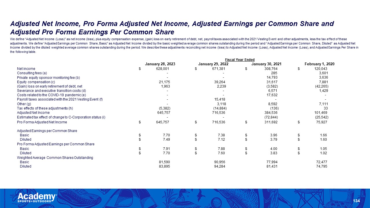 We define “Adjusted Net Income (Loss)” as net income (loss), plus equity compensation expense, (gain) loss on early retirement of debt, net, payroll taxes associated with the 2021 Vesting Event and other adjustments, less the tax effect of these adjustments. We define “Adjusted Earnings per Common Share, Basic” as Adjusted Net Income divided by the basic weighted average common shares outstanding during the period and “Adjusted Earnings per Common Share, Diluted” as Adjusted Net Income divided by the diluted weighted average common shares outstanding during the period. We describe these adjustments reconciling net income (loss) to Adjusted Net Income (Loss), Adjusted Net Income (Loss), and Adjusted Earnings Per Share in the following table.  134  Adjusted Net Income, Pro Forma Adjusted Net Income, Adjusted Earnings per Common Share and Adjusted Pro Forma Earnings Per Common Share  Fiscal Year Ended  January 28, 2023  January 29, 2022  January 30, 2021  February 1, 2020  Net income   $                628,001    $                671,381    $                  308,764    $               120,043   Consulting fees (a)                                -                                   -                                 285                          3,601   Private equity sponsor monitoring fee (b)                                -                                   -                            14,793                          3,636   Equity compensation (c)                        21,175                        39,264                          31,617                          7,881   (Gain) loss on early retirement of debt, net                          1,963                           2,239                          (3,582)                     (42,265)  Severance and executive transition costs (d)                                -                                   -                              6,571                          1,429   Costs related to the COVID-19 pandemic (e)                                -                                   -                            17,632                                -     Payroll taxes associated with the 2021 Vesting Event (f)                                -                          15,418                                   -                                  -     Other (g)                                -                             3,118                            8,592                          7,111   Tax effects of these adjustments (h)                        (5,382)                      (14,884)                             (136)                              33   Adjusted Net Income                      645,757                      716,536                        384,536                     101,469   Estimated tax effect of change to C-Corporation status (i)                                -                                   -                          (72,844)                     (25,542)  Pro Forma Adjusted Net Income   $                645,757    $                716,536    $                  311,692    $                 75,927   Adjusted Earnings per Common Share     Basic   $                       7.70    $                      7.38    $                        3.96    $                     1.66      Diluted   $                       7.49    $                      7.12    $                        3.79    $                     1.60   Pro Forma Adjusted Earnings per Common Share     Basic   $                       7.91    $                      7.88    $                        4.00    $                     1.05      Diluted   $                       7.70    $                      7.60    $                        3.83    $                     1.02   Weighted Average Common Shares Outstanding     Basic                        81,590                        90,956                          77,994                       72,477      Diluted                        83,895                        94,284    