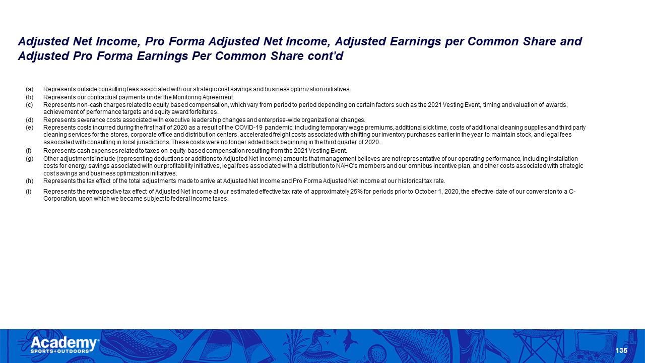 135  (a)  Represents outside consulting fees associated with our strategic cost savings and business optimization initiatives.  (b)  Represents our contractual payments under the Monitoring Agreement.  (c)  Represents non-cash charges related to equity based compensation, which vary from period to period depending on certain factors such as the 2021 Vesting Event, timing and valuation of awards, achievement of performance targets and equity award forfeitures.  (d)  Represents severance costs associated with executive leadership changes and enterprise-wide organizational changes.  (e)  Represents costs incurred during the first half of 2020 as a result of the COVID-19 pandemic, including temporary wage premiums, additional sick time, costs of additional cleaning supplies and third party cleaning services for the stores, corporate office and distribution centers, accelerated freight costs associated with shifting our inventory purchases earlier in the year to maintain stock, and legal fees associated with consulting in local jurisdictions. These costs were no longer added back beginning in the third quarter of 2020.  (f)  Represents cash expenses related to taxes on equity-based compensation resulting from the 2021 Vesting Event.  (g)  Other adjustments include (representing deductions or additions to Adjusted Net Income) amounts that management believes are not representative of our operating performance, including installation costs for energy savings associated with our profitability initiatives, legal fees associated with a distribution to NAHC's members and our omnibus incentive plan, and other costs associated with strategic cost savings and business optimization initiatives.  (h)  Represents the tax effect of the total adjustments made to arrive at Adjusted Net Income and Pro Forma Adjusted Net Income at our historical tax rate.  (i)  Represents the retrospective tax effect of Adjusted Net Income at our estimated effective tax rate of approximately 25% for periods prior to October 1, 2020, the effective date of our conversion to a C-Corporation, upon which we became subject to federal income taxes.  Adjusted Net Income, Pro Forma Adjusted Net Income, Adjusted Earnings per Common Share and Adjusted Pro Forma Earnings Per Common Share cont'd
