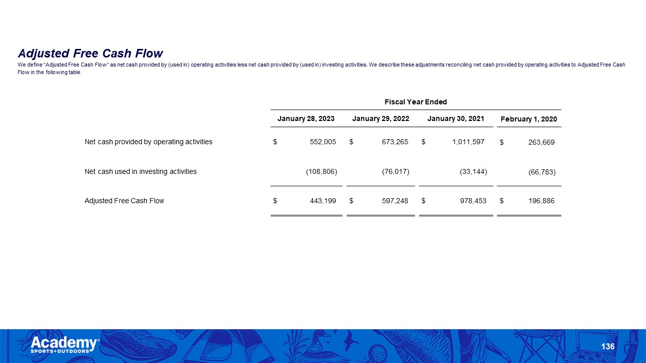136  We define “Adjusted Free Cash Flow” as net cash provided by (used in) operating activities less net cash provided by (used in) investing activities. We describe these adjustments reconciling net cash provided by operating activities to Adjusted Free Cash Flow in the following table.  Adjusted Free Cash Flow  Fiscal Year Ended  January 28, 2023     January 29, 2022     January 30, 2021  February 1, 2020  Net cash provided by operating activities   $ 552,005    $ 673,265    $ 1,011,597    $ 263,669   Net cash used in investing activities   (108,806)   (76,017)   (33,144)   (66,783)  Adjusted Free Cash Flow   $ 443,199    $ 597,248    $ 978,453    $ 196,886