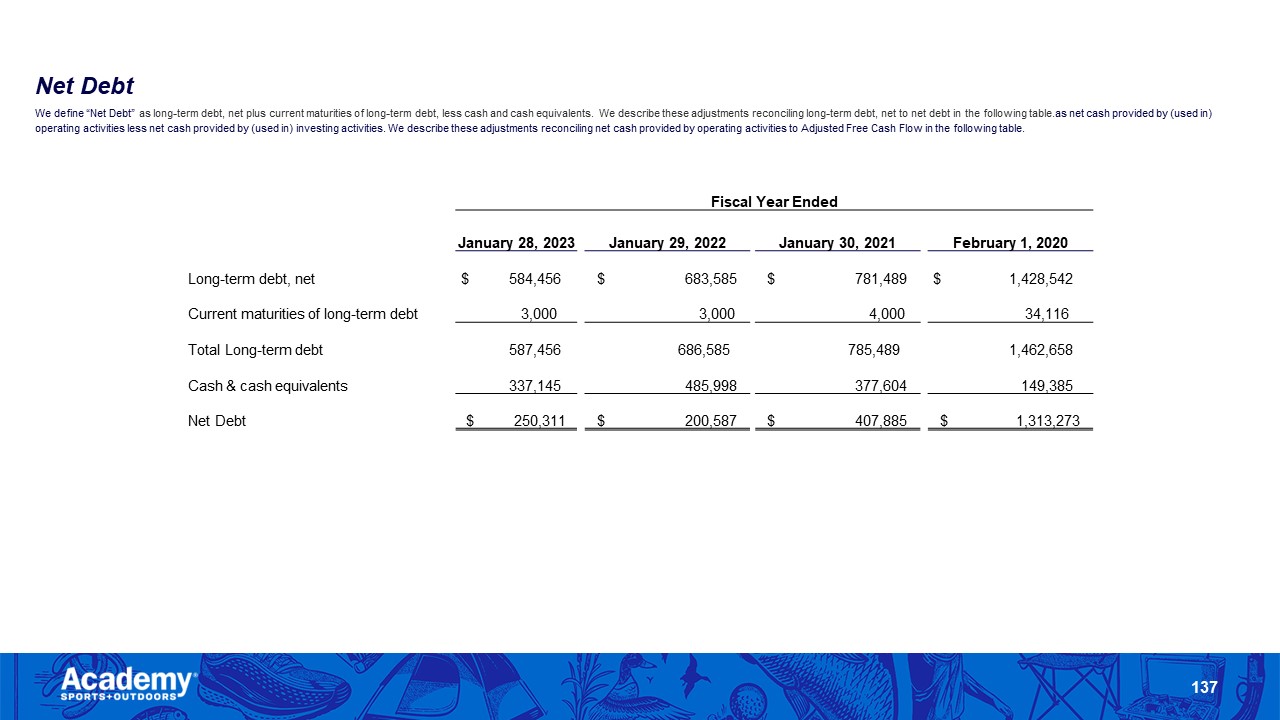 137  Fiscal Year Ended  January 28, 2023  January 29, 2022  January 30, 2021  February 1, 2020  Long-term debt, net   $          584,456    $                    683,585    $                    781,489    $                 1,428,542   Current maturities of long-term debt                  3,000                             3,000                             4,000                           34,116   Total Long-term debt               587,456                          686,585                          785,489                       1,462,658   Cash & cash equivalents               337,145                          485,998                          377,604                          149,385   Net Debt   $          250,311    $                    200,587    $                    407,885    $                 1,313,273   Net Debt  We define “Net Debt” as long-term debt, net plus current maturities of long-term debt, less cash and cash equivalents.  We describe these adjustments reconciling long-term debt, net to net debt in the following table.as net cash provided by (used in) operating activities less net cash provided by (used in) investing activities. We describe these adjustments reconciling net cash provided by operating activities to Adjusted Free Cash Flow in the following table.