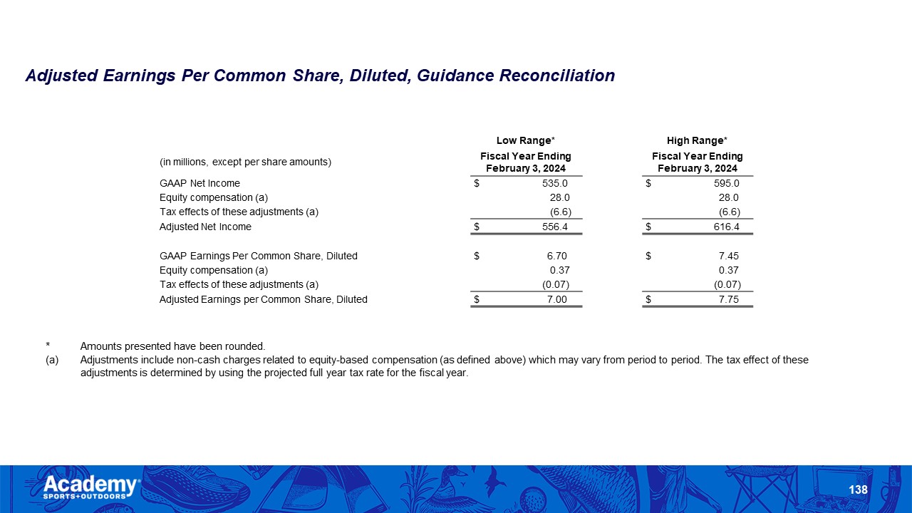 138  Low Range*  High Range*  (in millions, except per share amounts)  Fiscal Year Ending February 3, 2024  Fiscal Year Ending February 3, 2024  GAAP Net Income   $ 535.0    $ 595.0   Equity compensation (a)   28.0    28.0   Tax effects of these adjustments (a)   (6.6)   (6.6)  Adjusted Net Income   $ 556.4    $ 616.4   GAAP Earnings Per Common Share, Diluted   $ 6.70    $ 7.45   Equity compensation (a)   0.37    0.37   Tax effects of these adjustments (a)   (0.07)   (0.07)  Adjusted Earnings per Common Share, Diluted   $ 7.00    $ 7.75   Adjusted Earnings Per Common Share, Diluted, Guidance Reconciliation  *  Amounts presented have been rounded.  (a)  Adjustments include non-cash charges related to equity-based compensation (as defined above) which may vary from period to period. The tax effect of these adjustments is determined by using the projected full year tax rate for the fiscal year.