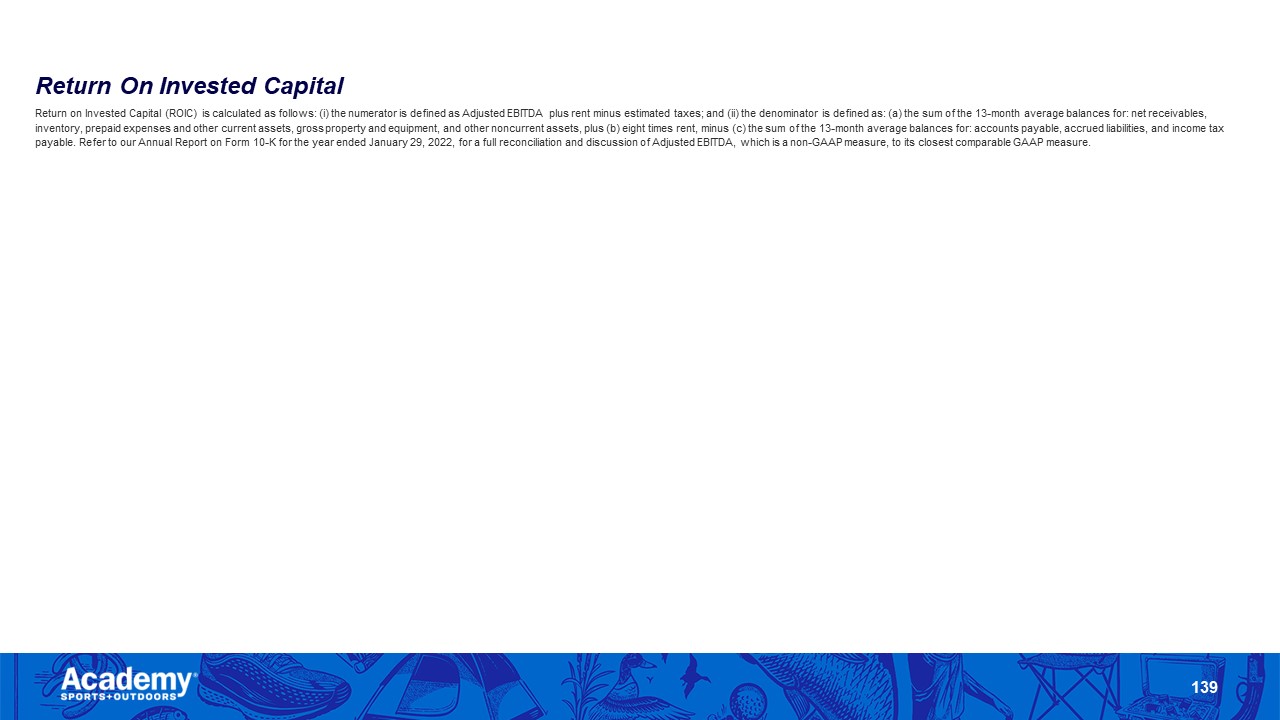 139  Return On Invested Capital  Return on Invested Capital (ROIC) is calculated as follows: (i) the numerator is defined as Adjusted EBITDA plus rent minus estimated taxes; and (ii) the denominator is defined as: (a) the sum of the 13-month average balances for: net receivables, inventory, prepaid expenses and other current assets, gross property and equipment, and other noncurrent assets, plus (b) eight times rent, minus (c) the sum of the 13-month average balances for: accounts payable, accrued liabilities, and income tax payable. Refer to our Annual Report on Form 10-K for the year ended January 29, 2022, for a full reconciliation and discussion of Adjusted EBITDA, which is a non-GAAP measure, to its closest comparable GAAP measure.