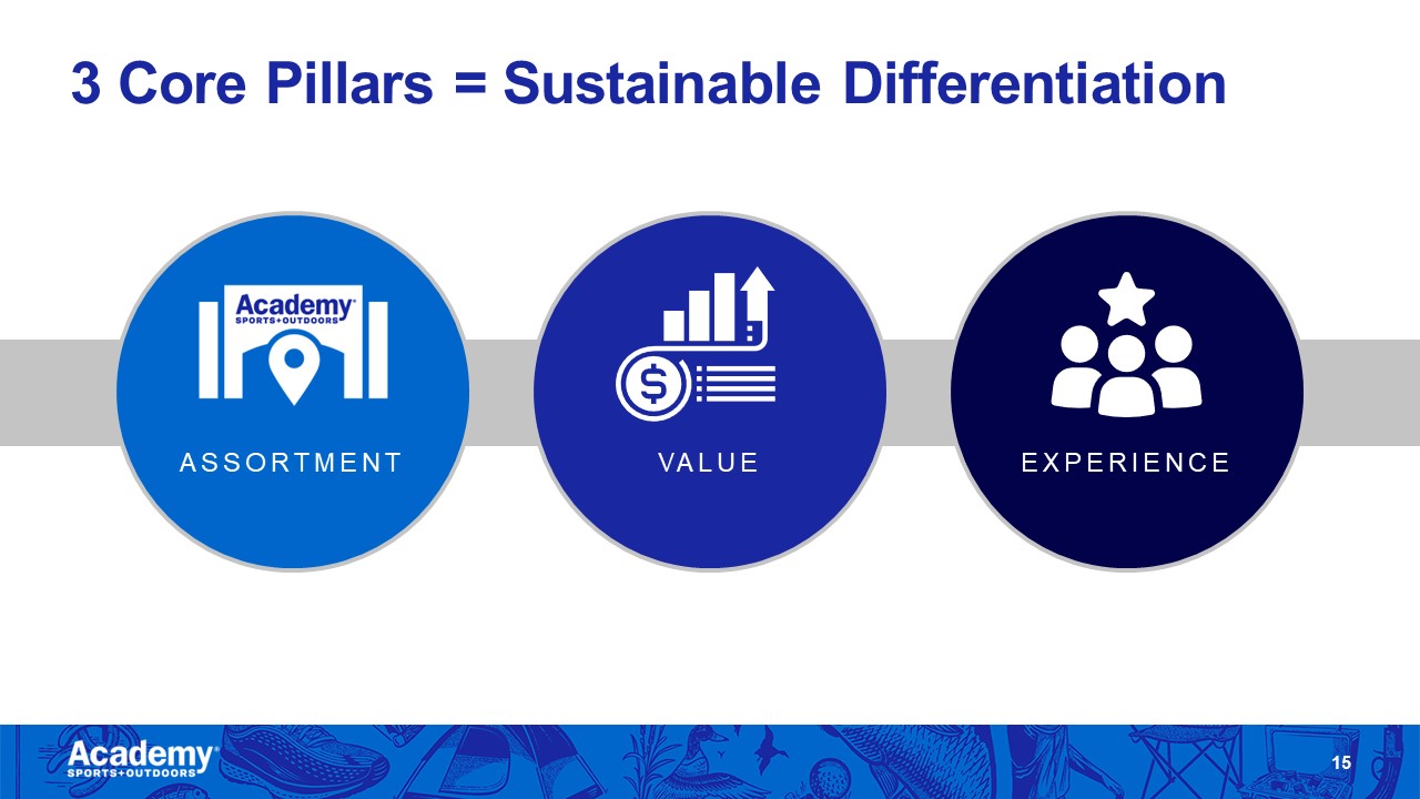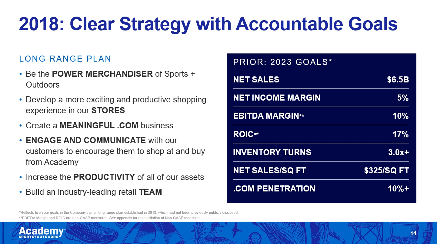 2018: Clear Strategy with Accountable Goals   LONG RANGE PLAN  Be the POWER MERCHANDISER of Sports + Outdoors  Develop a more exciting and productive shopping experience in our STORES  Create a MEANINGFUL ‘.COM’ business  ENGAGE AND COMMUNICATE with our customers to encourage them to shop at and buy from Academy  Increase the PRODUCTIVITY of all of our assets  Build an industry-leading retail TEAM  14  PRIOR: 2023 Goals*  NET SALES  $6.5B  NET INCOME MARGIN  5%  EBITDA MARGIN**  10%  ROIC**  17%  INVENTORY TURNS  3.0x+  NET SALES/SQ FT  $325/SQ FT  .COM PENETRATION  10%+  *Reflects five-year goals in the Company's prior long range plan established in 2018, which had not been previously publicly disclosed.  **EBITDA Margin and ROIC are non-GAAP measures. See appendix for reconciliation of Non-GAAP measures.