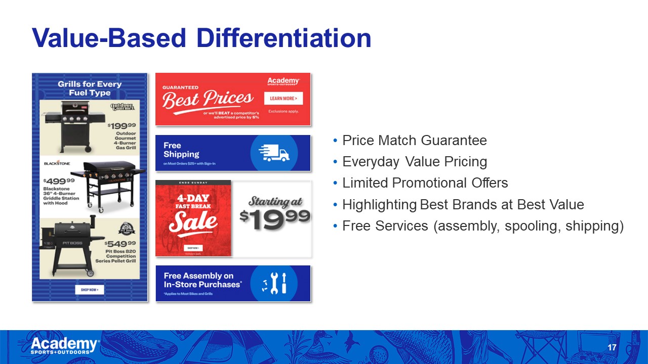 Value-Based Differentiation   17  Price Match Guarantee  Everyday Value Pricing  Limited Promotional Offers  Highlighting Best Brands at Best Value  Free Services (assembly, spooling, shipping)