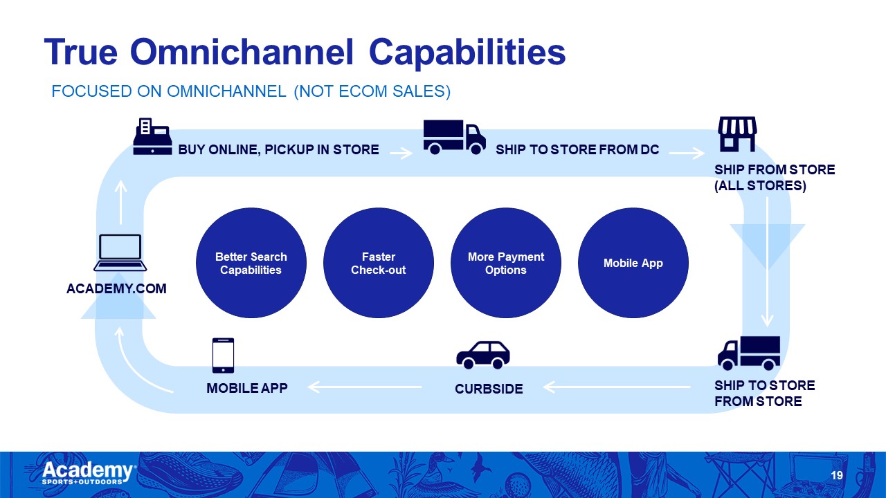 True Omnichannel Capabilities  19  BUY ONLINE, PICKUP IN STORE  SHIP TO STORE FROM DC  SHIP FROM STORE (ALL STORES)  SHIP TO STORE FROM STORE  CURBSIDE  MOBILE APP  ACADEMY.COM  Better Search Capabilities  Faster Check-out  More Payment Options  Mobile App  FOCUSED ON OMNICHANNEL (NOT ECOM SALES)