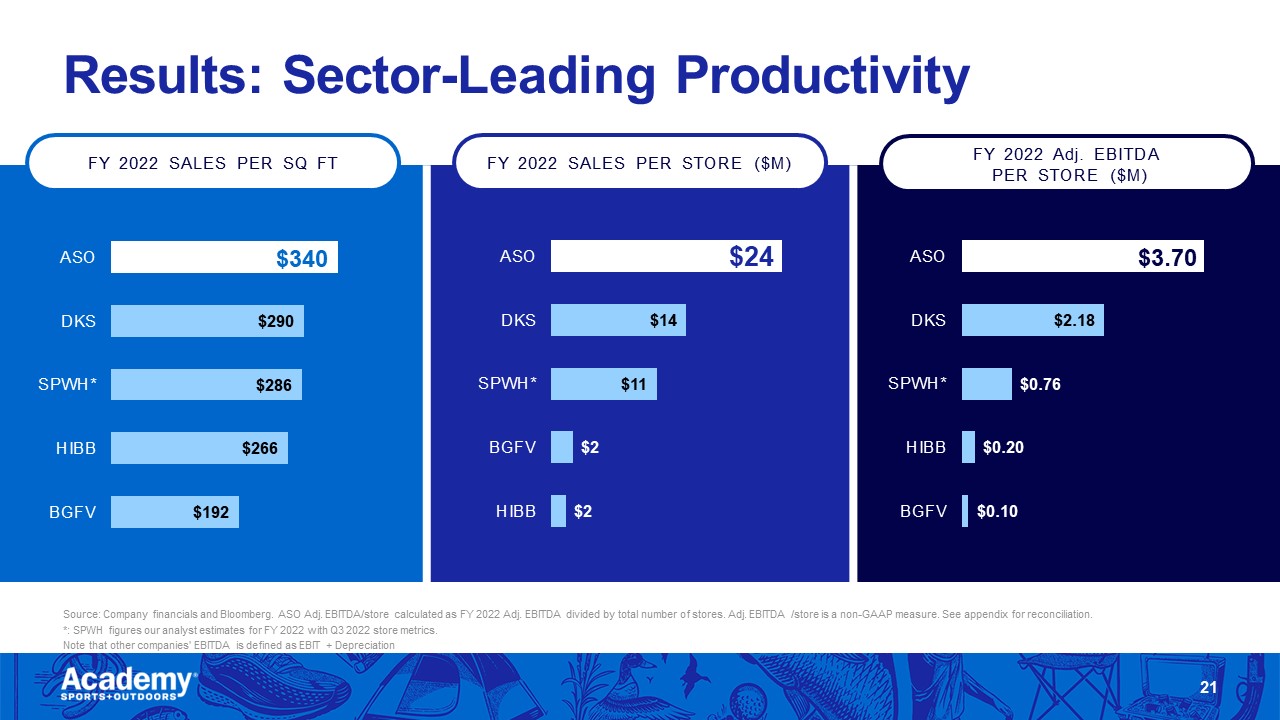Results: Sector-Leading Productivity  21  Source: Company financials and Bloomberg. ASO Adj. EBITDA/store calculated as FY 2022 Adj. EBITDA divided by total number of stores. Adj. EBITDA /store is a non-GAAP measure. See appendix for reconciliation.  *: SPWH figures our analyst estimates for FY 2022 with Q3 2022 store metrics.  Note that other companies' EBITDA is defined as EBIT + Depreciation  FY 2022 SALES PER SQ FT  FY 2022 SALES PER STORE ($M)  FY 2022 Adj. EBITDA   PER STORE ($M)