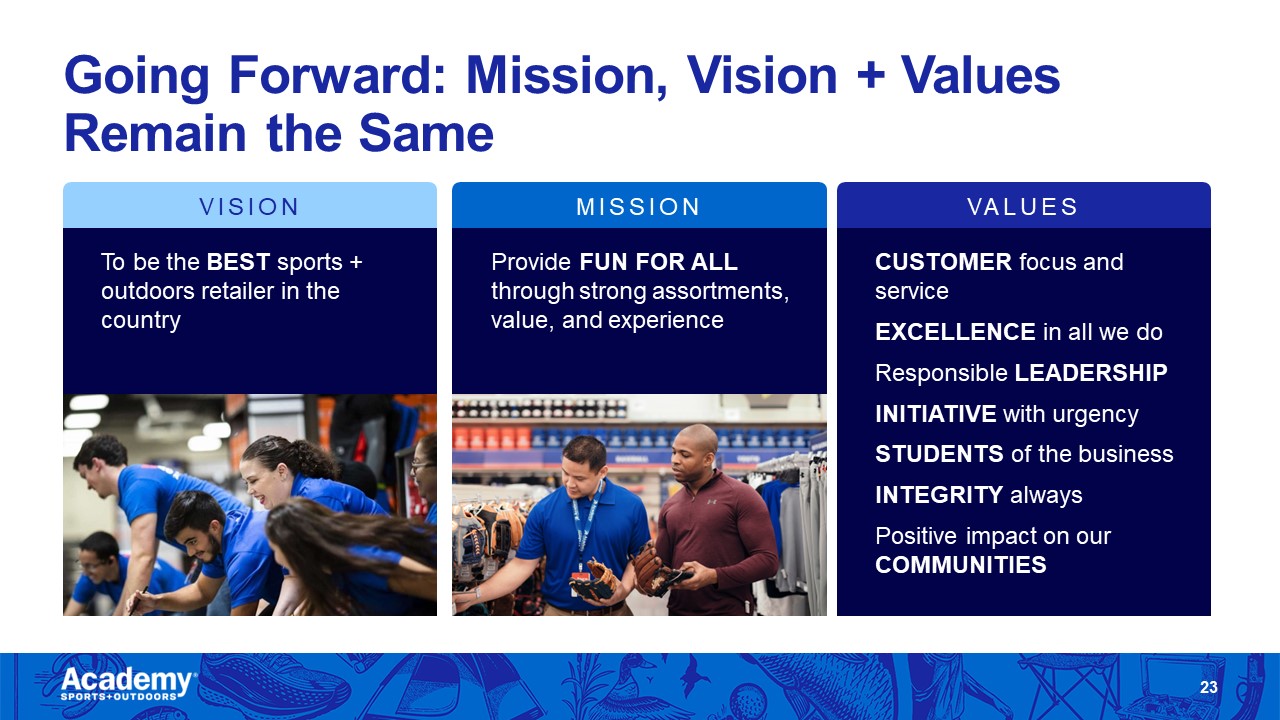 Going Forward: Mission, Vision + Values Remain the Same  23  VALUES  CUSTOMER focus and service  EXCELLENCE in all we do  Responsible LEADERSHIP  INITIATIVE with urgency  STUDENTS of the business  INTEGRITY always   Positive impact on our COMMUNITIES  VISION  To be the BEST sports + outdoors retailer in the country  MISSION  Provide FUN FOR ALL through strong assortments, value, and experience