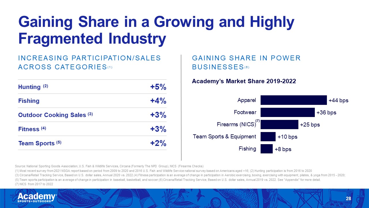 Significant Market Opportunity  27  $175B+ total U.S. addressable market (“TAM”)   Lasting shift of customer spend towards outdoor activities, in-home health and wellness, nesting and experiences  Increased demand across all demographics and geographies  Largest sporting goods competitor has less than 10% market share  U.S. Sporting Goods & Outdoor Recreation Market  ~$175B+  2022 TAM     Sports & Fitness $13B  Outdoor $27B  Footwear $47B  Apparel $88B  One of Fastest Growing Sectors in Retail with Sustainable Tailwinds  Source: Circana/Retail Tracking Service, Based on U.S. dollar sales, Annual 2019 vs. 2022. See "Appendix" for more detail. and Proprietary Data  (1)Circana/Retail Tracking Service, Based on U.S. dollar sales, Annual 2019 vs. 2022. See "Appendix" for more detail.  (2)Outdoors includes Firearms TAM from NICS and Circana/Retail Tracking Service, Based on U.S. dollar sales, Annual 2019 vs. 2022. See "Appendix" for more detail  (3)Sports & Fitness from Circana/Retail Tracking Service, Based on U.S. dollar sales, Annual 2022. Team Sports (Excludes Golf), Sports Equipment (Winter/Snow Sports, Water Sports, Health and Fitness Eq.) and Tech