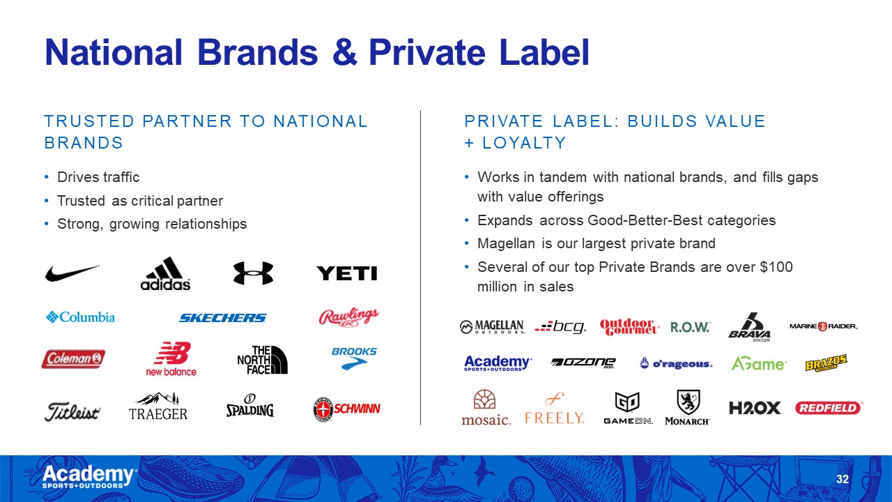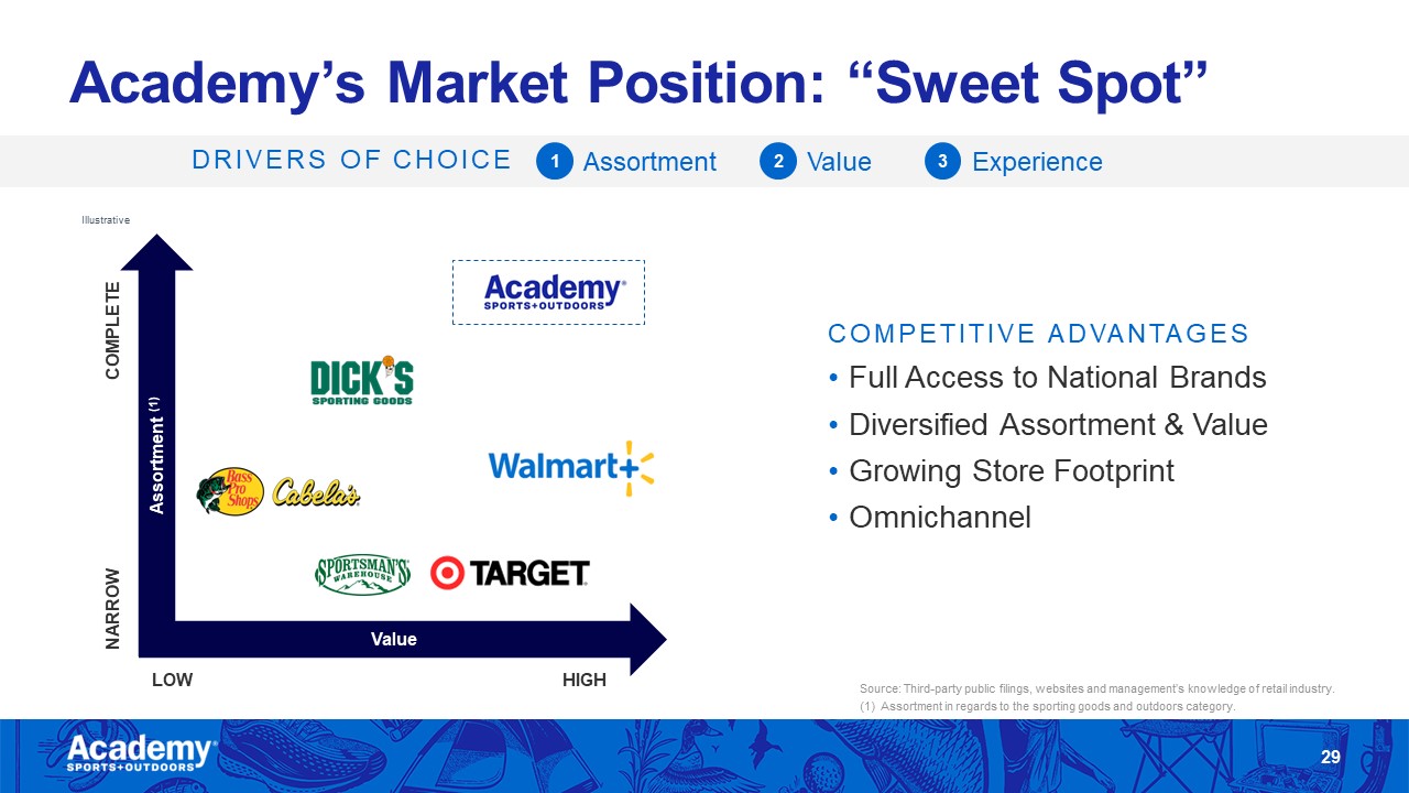 Academy’s Market Position: “Sweet Spot”  29  Source: Third-party public filings, websites and management’s knowledge of retail industry.   (1)  Assortment in regards to the sporting goods and outdoors category.  Competitive Advantages  Full Access to National Brands  Diversified Assortment & Value  Growing Store Footprint  Omnichannel  Drivers of Choice  1  Assortment  2  Value  3  Experience  Assortment (1)  Value  NARROW  COMPLETE  Illustrative  HIGH  LOW