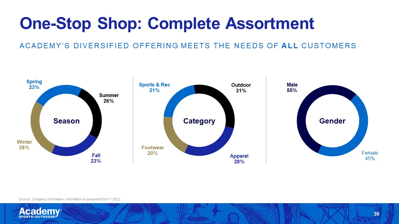 Season  Category  Gender  One-Stop Shop: Complete Assortment  Academy’s Diversified Offering Meets the Needs of ALL Customers  30  Source:  Company information; Information is presented for FY 2022.