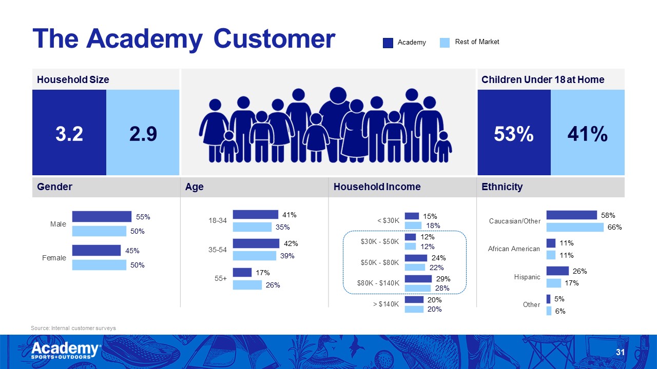 Household Size  Children Under 18 at Home  3.2  2.9  53%  41%  Gender  Age  Household Income  Ethnicity  The Academy Customer  31  Academy  Rest of Market  Source: Internal customer surveys