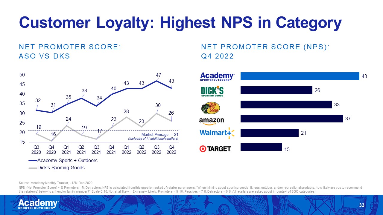 Customer Loyalty: Highest NPS in Category  33  Source: Academy Monthly Tracker, L12M Dec 2022  NPS (Net Promoter Score) = % Promoters - % Detractors; NPS is calculated from this question asked of retailer purchasers: “When thinking about sporting goods, fitness, outdoor, and/or recreational products, how likely are you to recommend the retailer(s) below to a friend or family member?” Scale 0-10, Not at all likely – Extremely Likely; Promoters = 9-10, Passives = 7-8, Detractors = 0-6. All retailers are asked about in context of SGO categories.  Net Promoter Score (NPS): Q4 2022  Net Promoter Score: ASO vs DKS  Market Average = 21  (inclusive of 11 additional retailers)