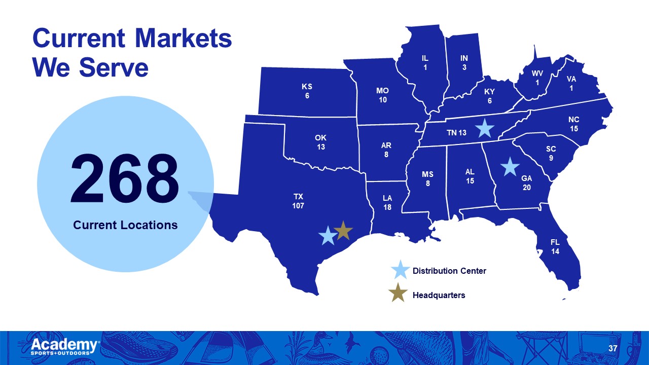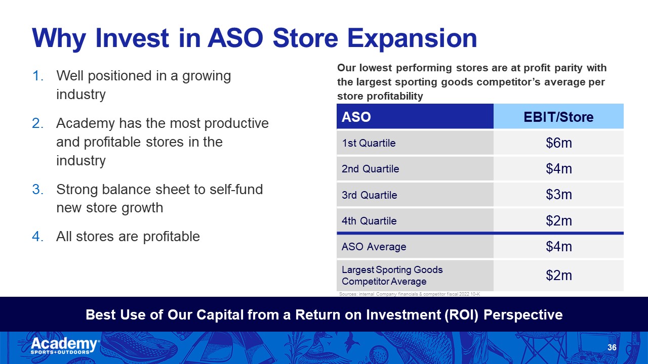 Why Invest in ASO Store Expansion  Well positioned in a growing industry  Academy has the most productive and profitable stores in the industry  Strong balance sheet to self-fund new store growth  All stores are profitable  36  Our lowest performing stores are at profit parity with the largest sporting goods competitor’s average per store profitability  ASO  EBIT/Store  1st Quartile  $6m  2nd Quartile  $4m  3rd Quartile  $3m  4th Quartile  $2m  ASO Average  $4m  Largest Sporting Goods Competitor Average   $2m  Best Use of Our Capital from a Return on Investment (ROI) Perspective  Sources: internal Company financials & competitor fiscal 2022 10-K