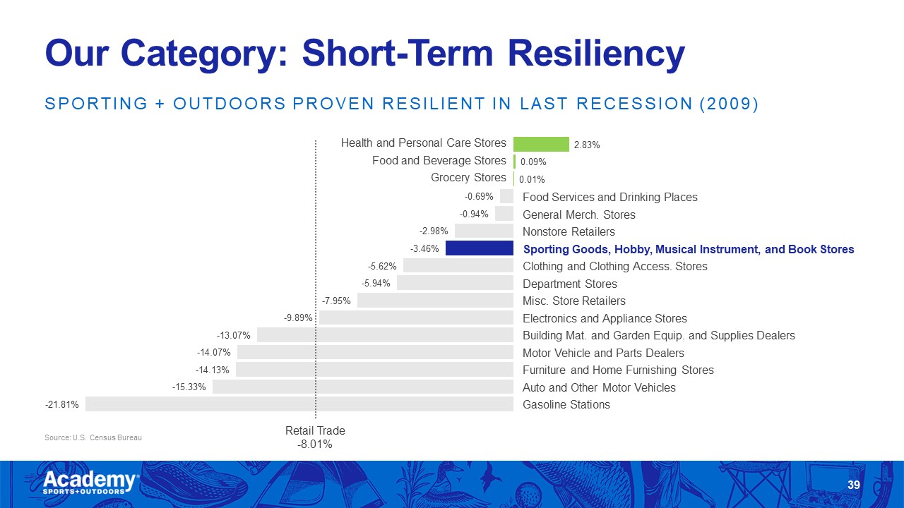 Our Category: Short-Term Resiliency  Sporting + Outdoors Proven Resilient in Last Recession (2009)  39  Source: U.S. Census Bureau  Health and Personal Care Stores  Food and Beverage Stores  Grocery Stores  Health and Personal Care Stores  Food Services and Drinking Places  General Merch. Stores  Nonstore Retailers  Sporting Goods, Hobby, Musical Instrument, and Book Stores  Clothing and Clothing Access. Stores  Department Stores  Misc. Store Retailers  Electronics and Appliance Stores  Building Mat. and Garden Equip. and Supplies Dealers  Motor Vehicle and Parts Dealers  Furniture and Home Furnishing Stores  Auto and Other Motor Vehicles  Gasoline Stations  Retail Trade  -8.01%