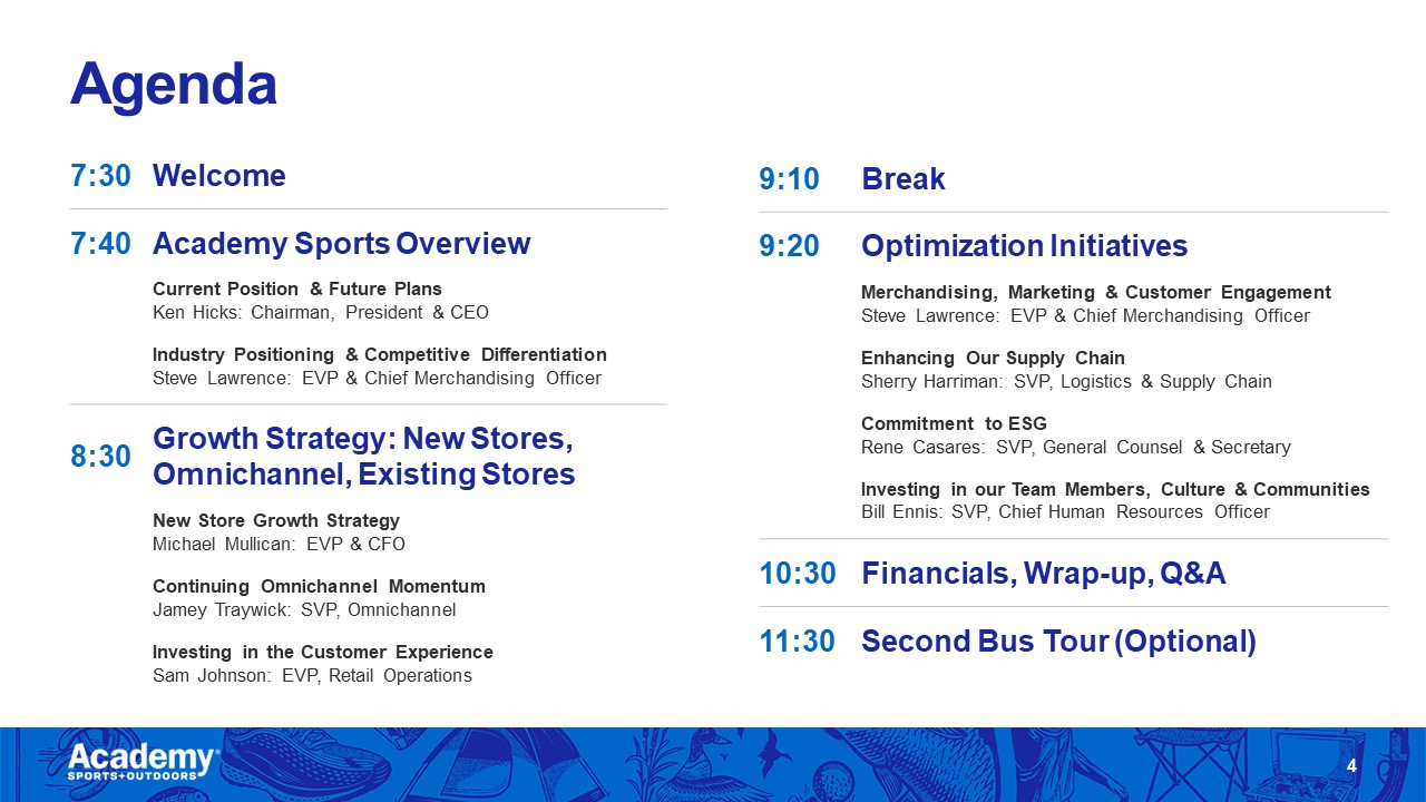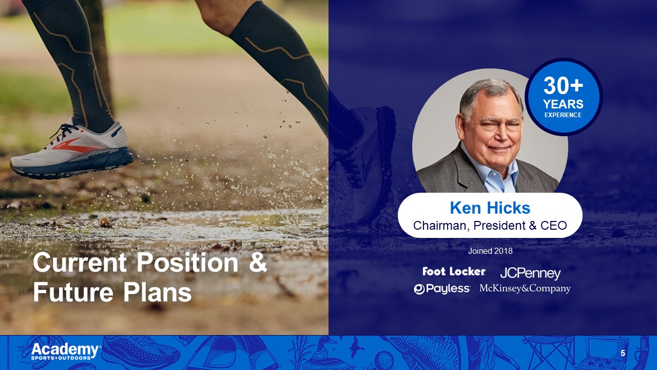 Agenda  7:30  Welcome  7:40  Academy Sports Overview  Current Position & Future PlansKen Hicks: Chairman, President & CEO  Industry Positioning & Competitive DifferentiationSteve Lawrence: EVP & Chief Merchandising Officer  8:30  Growth Strategy: New Stores, Omnichannel, Existing Stores  New Store Growth StrategyMichael Mullican: EVP & CFO  Continuing Omnichannel MomentumJamey Traywick: SVP, Omnichannel  Investing in the Customer ExperienceSam Johnson: EVP, Retail Operations  4  9:10  Break  9:20  Optimization Initiatives   Merchandising, Marketing & Customer EngagementSteve Lawrence: EVP & Chief Merchandising Officer  Enhancing Our Supply ChainSherry Harriman: SVP, Logistics & Supply Chain  Commitment to ESGRene Casares: SVP, General Counsel & Secretary  Investing in our Team Members, Culture & Communities Bill Ennis: SVP, Chief Human Resources Officer  10:30  Financials, Wrap-up, Q&A  11:30  Second Bus Tour (Optional)