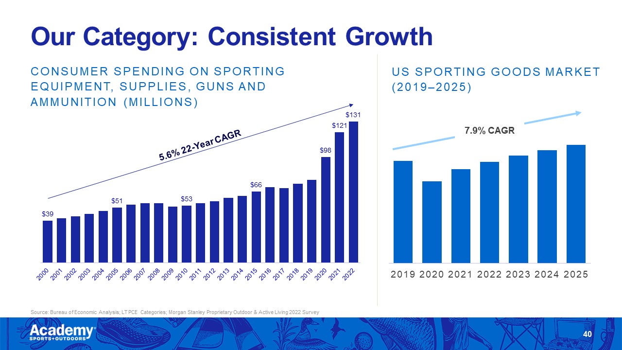 Our Category: Consistent Growth  Consumer Spending on Sporting Equipment, Supplies, Guns and Ammunition (millions)  40  Source: Bureau of Economic Analysis; LT PCE Categories; Morgan Stanley Proprietary Outdoor & Active Living 2022 Survey  5.6% 22-Year CAGR  US Sporting Goods Market (2019–2025)  7.9% CAGR