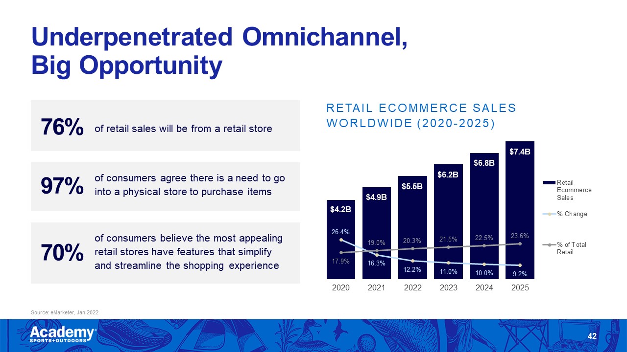 Underpenetrated Omnichannel, Big Opportunity  42  Source: eMarketer, Jan 2022  Retail Ecommerce Sales Worldwide (2020-2025)  of retail sales will be from a retail store  of consumers agree there is a need to go into a physical store to purchase items  of consumers believe the most appealing retail stores have features that simplify and streamline the shopping experience  76%  97%  70%  $4.2B  $4.9B  $5.5B  $6.2B  $6.8B  $7.4B