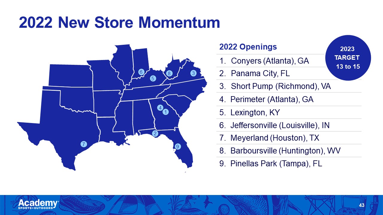 1  4  5  8  7  6  9  3  2  2022 New Store Momentum  43  2022 Openings   Conyers (Atlanta), GA   Panama City, FL   Short Pump (Richmond), VA  4. Perimeter (Atlanta), GA  5. Lexington, KY  6. Jeffersonville (Louisville), IN  7. Meyerland (Houston), TX  8. Barboursville (Huntington), WV  9. Pinellas Park (Tampa), FL  2023   TARGET   13 to 15
