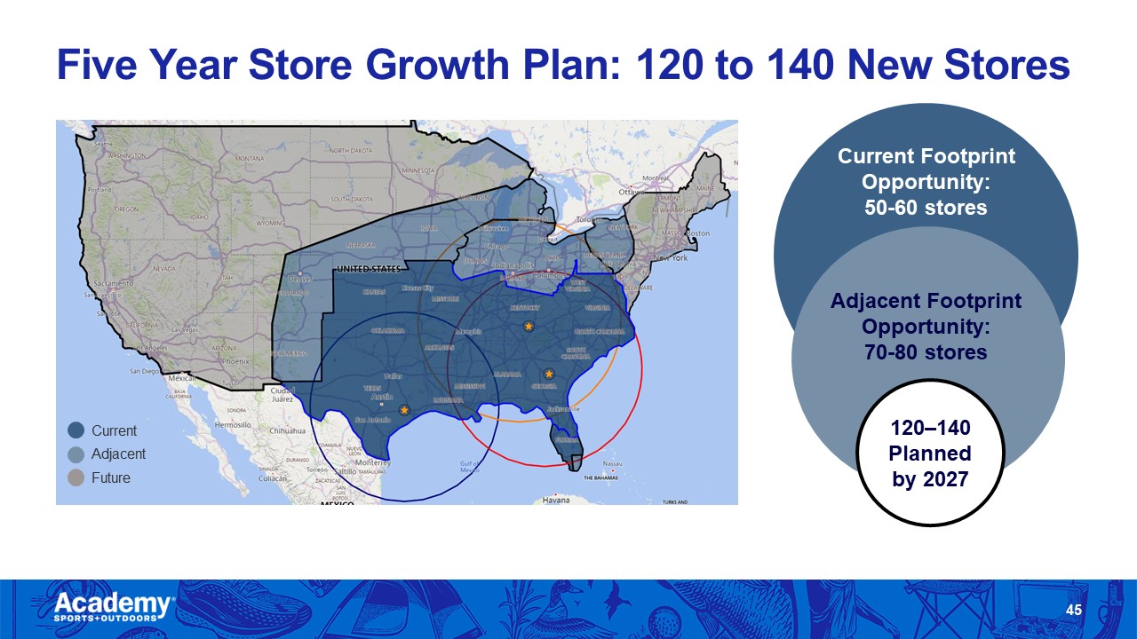 Five Year Store Growth Plan: 120 to 140 New Stores  45  120–140  Planned by 2027  Current Footprint Opportunity:  50-60 stores  Adjacent Footprint  Opportunity:  70-80 stores  Current  Adjacent  Future