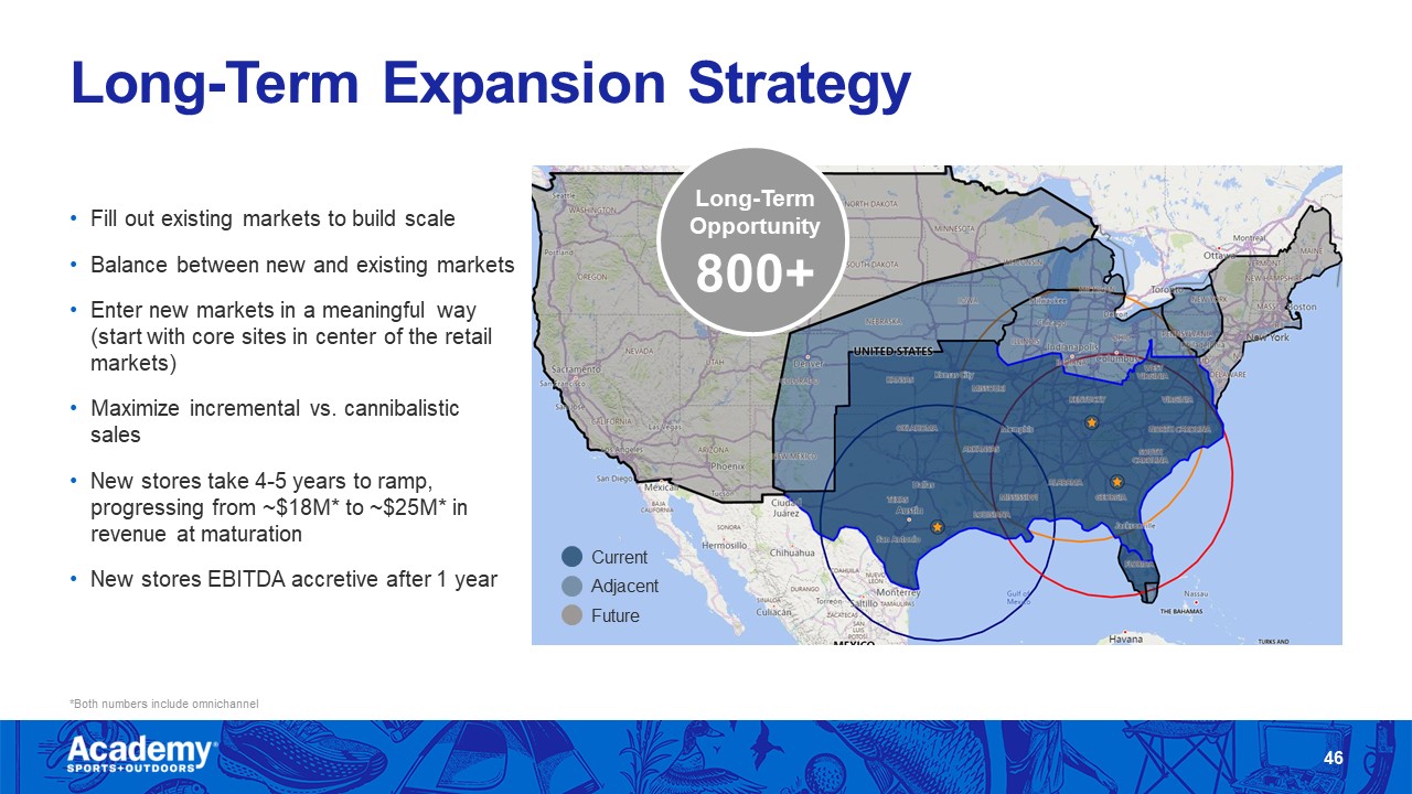 Long-Term Expansion Strategy  Fill out existing markets to build scale  Balance between new and existing markets  Enter new markets in a meaningful way (start with core sites in center of the retail markets)  Maximize incremental vs. cannibalistic sales  New stores take 4-5 years to ramp, progressing from ~$18M* to ~$25M* in revenue at maturation  New stores EBITDA accretive after 1 year   46  Long-TermOpportunity800+  *Both numbers include omnichannel   Current  Adjacent  Future