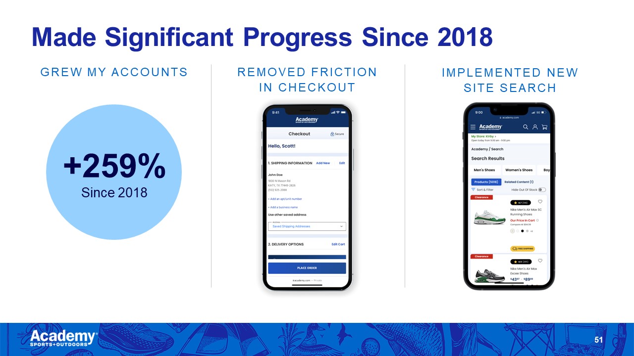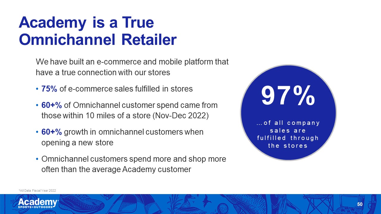 Academy is a True Omnichannel Retailer  We have built an e-commerce and mobile platform that have a true connection with our stores  75% of e-commerce sales fulfilled in stores  60+% of Omnichannel customer spend came from those within 10 miles of a store (Nov-Dec 2022)  60+% growth in omnichannel customers when opening a new store  Omnichannel customers spend more and shop more often than the average Academy customer  50  *All Data Fiscal Year 2022  97%     …of all company sales are fulfilled through the stores