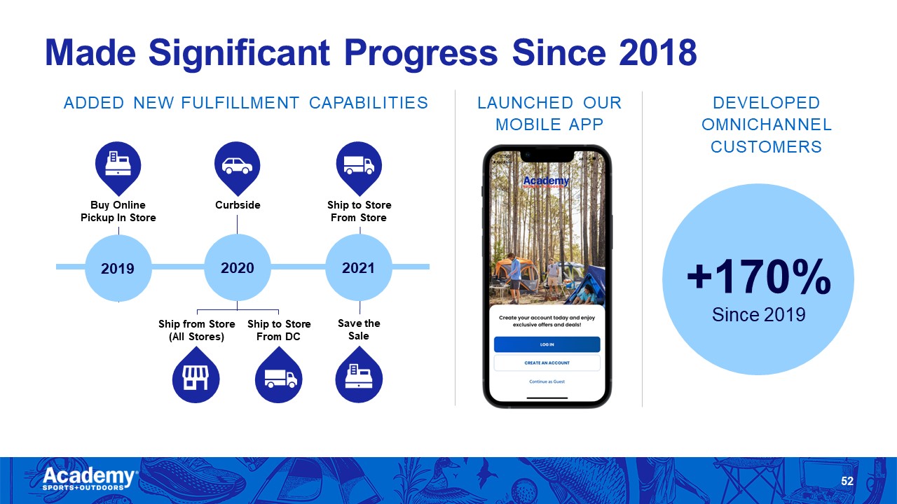 Made Significant Progress Since 2018  Added New Fulfillment Capabilities  52  Launched our Mobile App  Developed Omnichannel Customers  Ship from Store  (All Stores)  Ship to Store  From DC  Buy Online  Pickup In Store  Curbside  Ship to Store  From Store  Save the  Sale  2019  2020  2021  +170%Since 2019