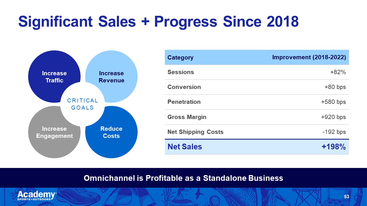 Significant Sales + Progress Since 2018  53  Category  Improvement (2018-2022)  Sessions  +82%  Conversion  +80 bps  Penetration  +580 bps  Gross Margin  +920 bps  Net Shipping Costs  -192 bps  Net Sales  +198%  Increase Traffic  Increase Revenue  Increase Engagement  Reduce Costs  Critical Goals  Omnichannel is Profitable as a Standalone Business
