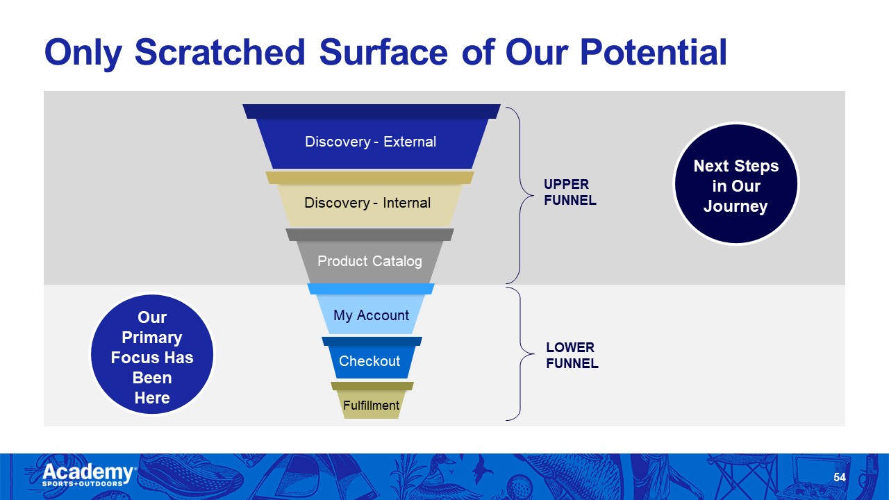 `  Only Scratched Surface of Our Potential  54  UPPER FUNNEL  LOWER  FUNNEL  Internal  Product Catalog  Discovery - External  Discovery - Internal  Fulfillment  Checkout  My Account  Our   Primary Focus Has Been   Here  Next Steps in Our Journey