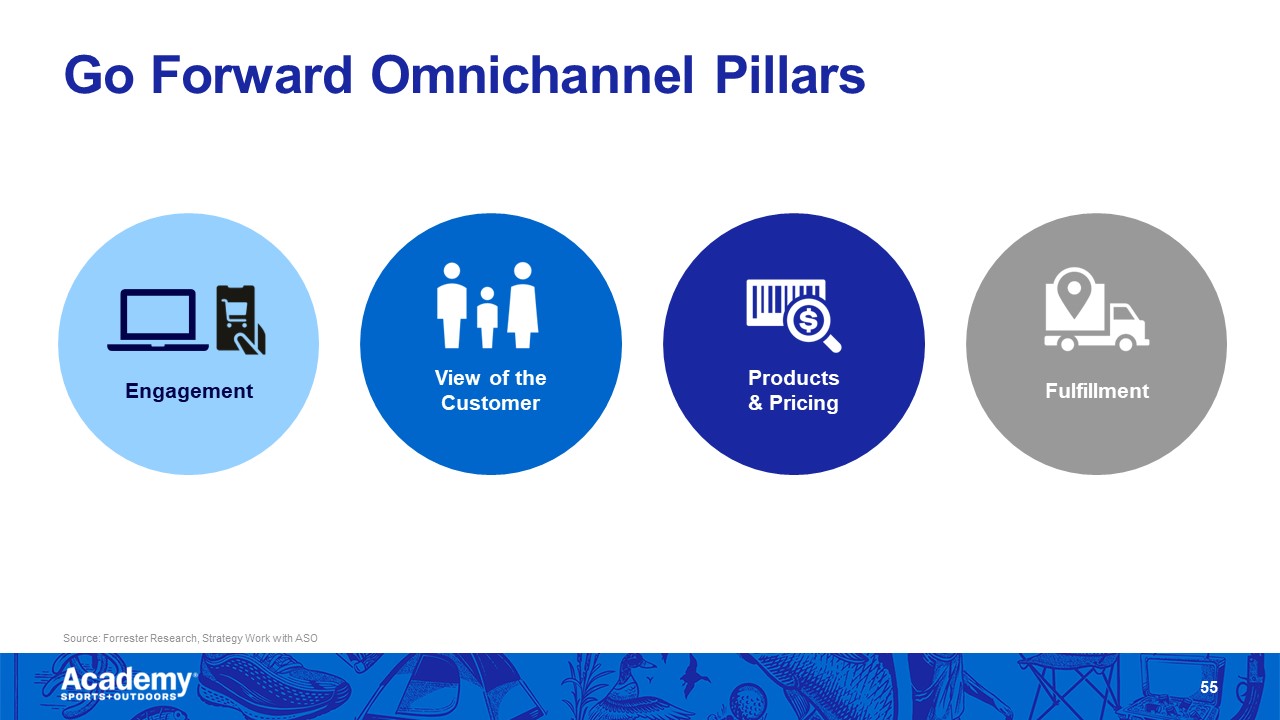 Go Forward Omnichannel Pillars  55  Source: Forrester Research, Strategy Work with ASO  Engagement  View of the Customer  Products & Pricing  Fulfillment