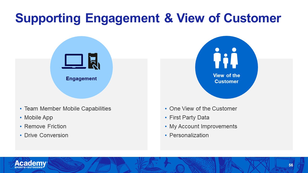 Supporting Engagement & View of Customer  Team Member Mobile Capabilities  Mobile App  Remove Friction  Drive Conversion  56  One View of the Customer  First Party Data  My Account Improvements  Personalization  Engagement  View of the Customer
