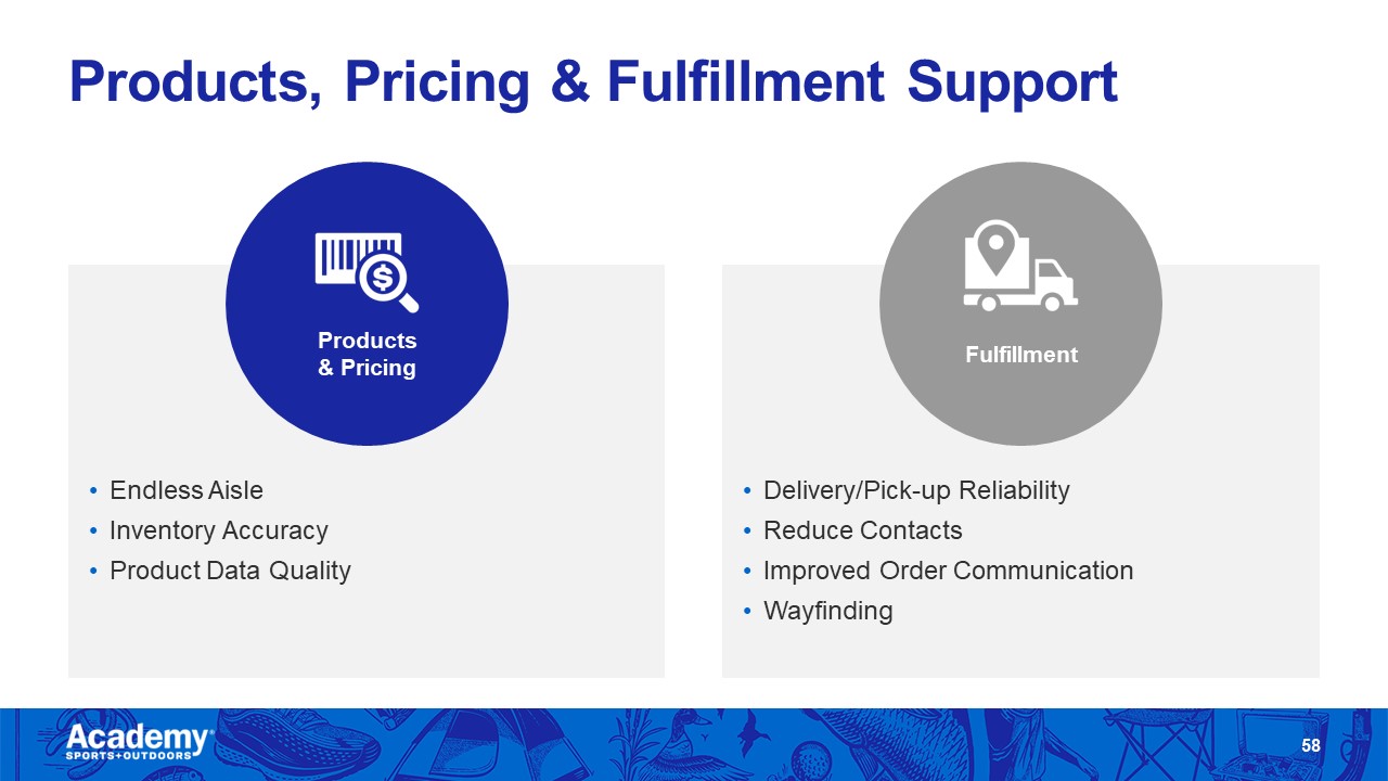 Products, Pricing & Fulfillment Support   Endless Aisle  Inventory Accuracy  Product Data Quality  58  Delivery/Pick-up Reliability  Reduce Contacts  Improved Order Communication  Wayfinding  Products & Pricing  Fulfillment