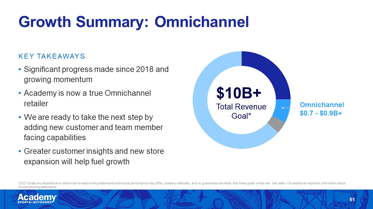 Growth Summary: Omnichannel  KEY TAKEAWAYS  Significant progress made since 2018 and growing momentum  Academy is now a true Omnichannel retailer  We are ready to take the next step by adding new customer and team member facing capabilities  Greater customer insights and new store expansion will help fuel growth  61  $10B+   Total Revenue Goal*  Omnichannel  $0.7 - $0.9B+  *2027 Goals are aspirational or otherwise forward-looking statements and actual performance may differ, possibly materially, and no guarantees are made that these goals will be met. See slide 3 for additional important information about forward-looking statements.