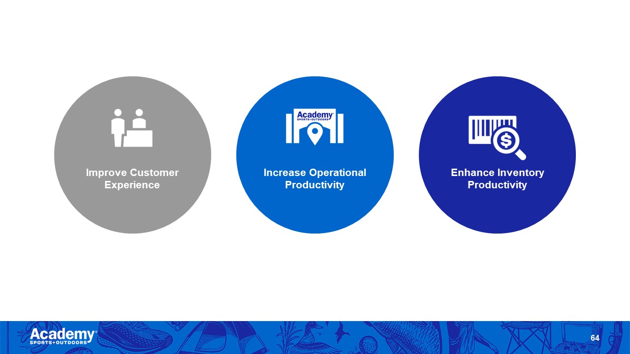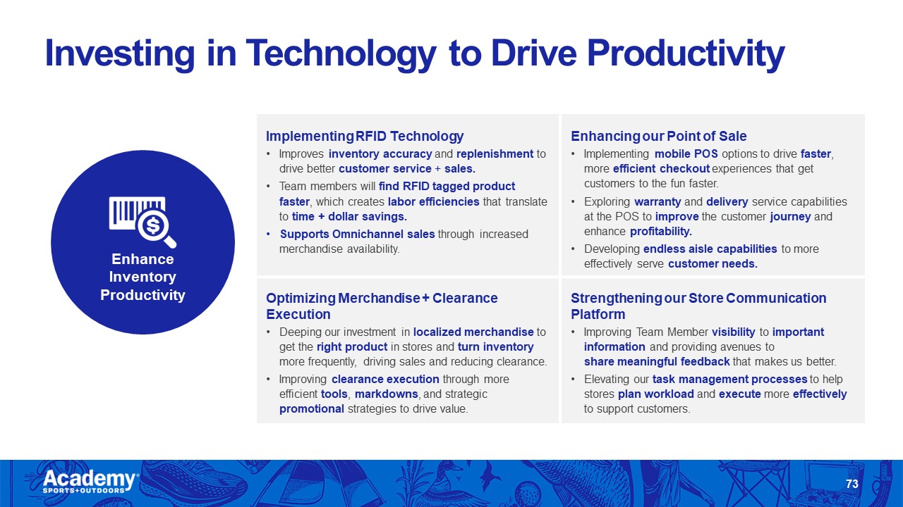 Investing in Technology to Drive Productivity  73  Enhance Inventory Productivity  Implementing RFID Technology  Improves inventory accuracy and replenishment to drive better customer service + sales.  Team members will find RFID tagged product faster, which creates labor efficiencies that translate to time + dollar savings.  Supports Omnichannel sales through increased merchandise availability.  Enhancing our Point of Sale  Implementing mobile POS options to drive faster, more efficient checkout experiences that get customers to the fun faster.  Exploring warranty and delivery service capabilities at the POS to improve the customer journey and enhance profitability.  Developing endless aisle capabilities to more effectively serve customer needs.  Optimizing Merchandise + Clearance Execution  Deeping our investment in localized merchandise to get the right product in stores and turn inventory more frequently, driving sales and reducing clearance.  Improving clearance execution through more efficient tools, markdowns, and strategic promotional strategies to drive value.  Strengthening our Store Communication Platform  Improving Team Member visibility to important information and providing avenues to share meaningful feedback that makes us better.  Elevating our task management processes to help stores plan workload and execute more effectively to support customers.